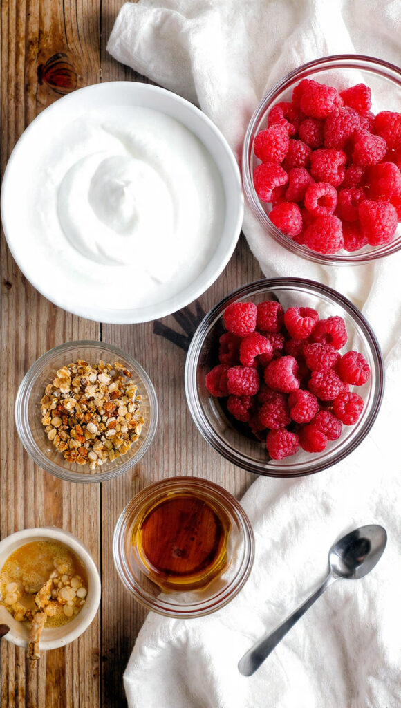 - Assemble the Dish: Spoon a layer of the yogurt mixture into the bottom of each glass, add a layer of raspberries, then sprinkle granola. Repeat the layers until the glass is filled.