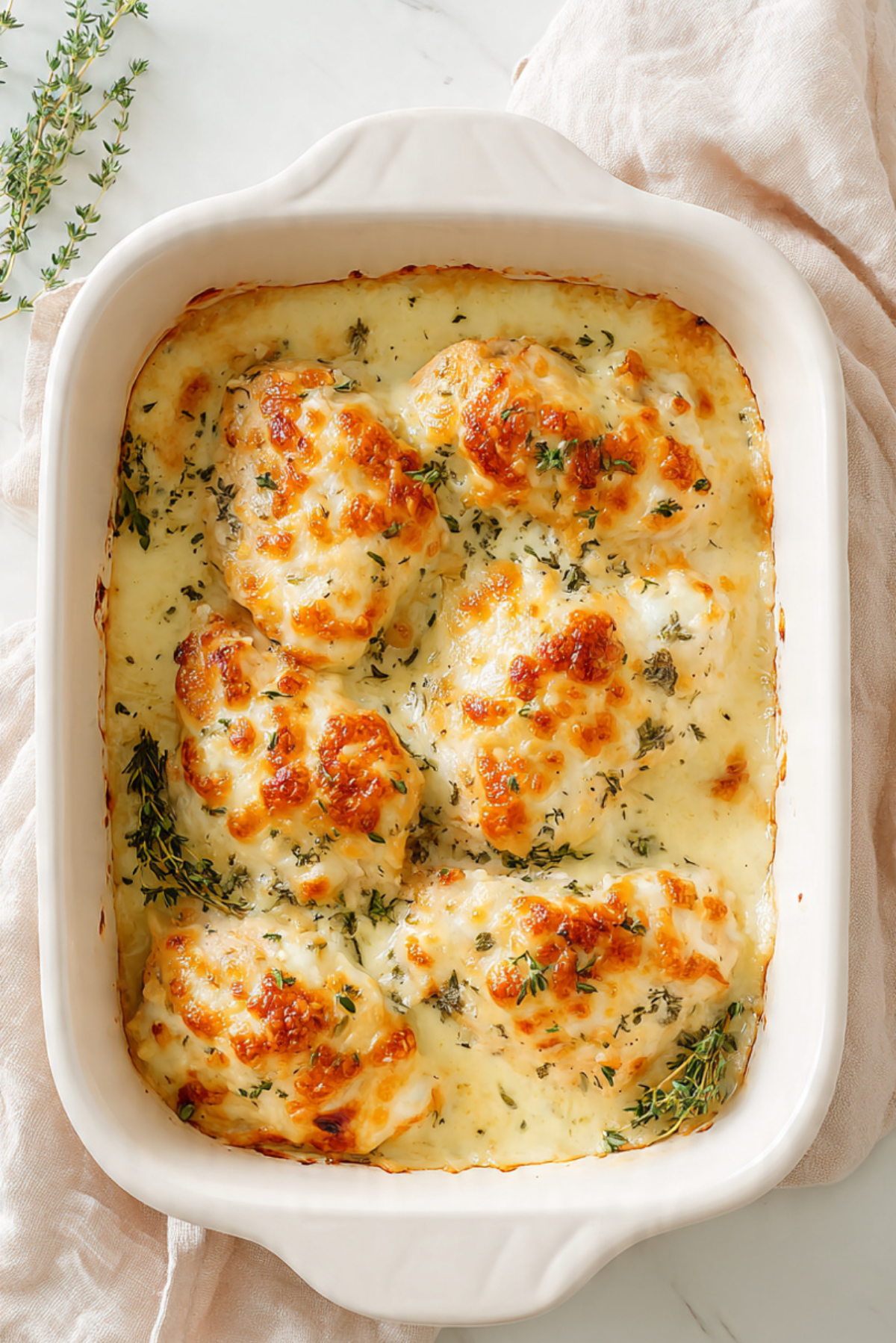 The top layer is golden and slightly crisp, while underneath you get tender, juicy chicken coated in a smooth, creamy sauce. The garlic gently perfumes the dish without overpowering it, and the cheese adds that mild, stretchy richness. It is soft, savory, and comforting all at once. This one’s a total game-changer for busy weeknights.