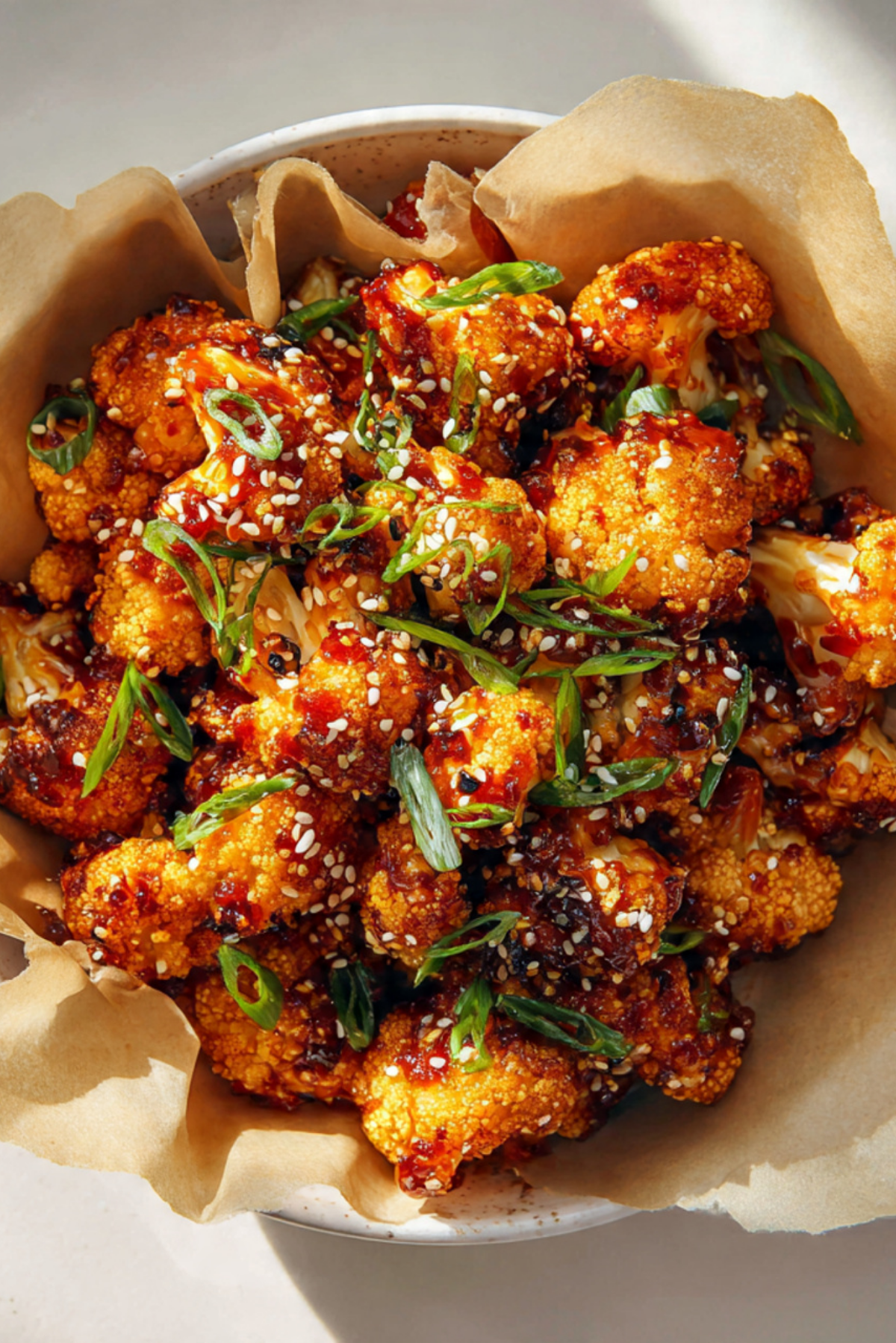 Toss crispy cauliflower in the warm sauce, sprinkle with sesame seeds and green onions, and serve hot.