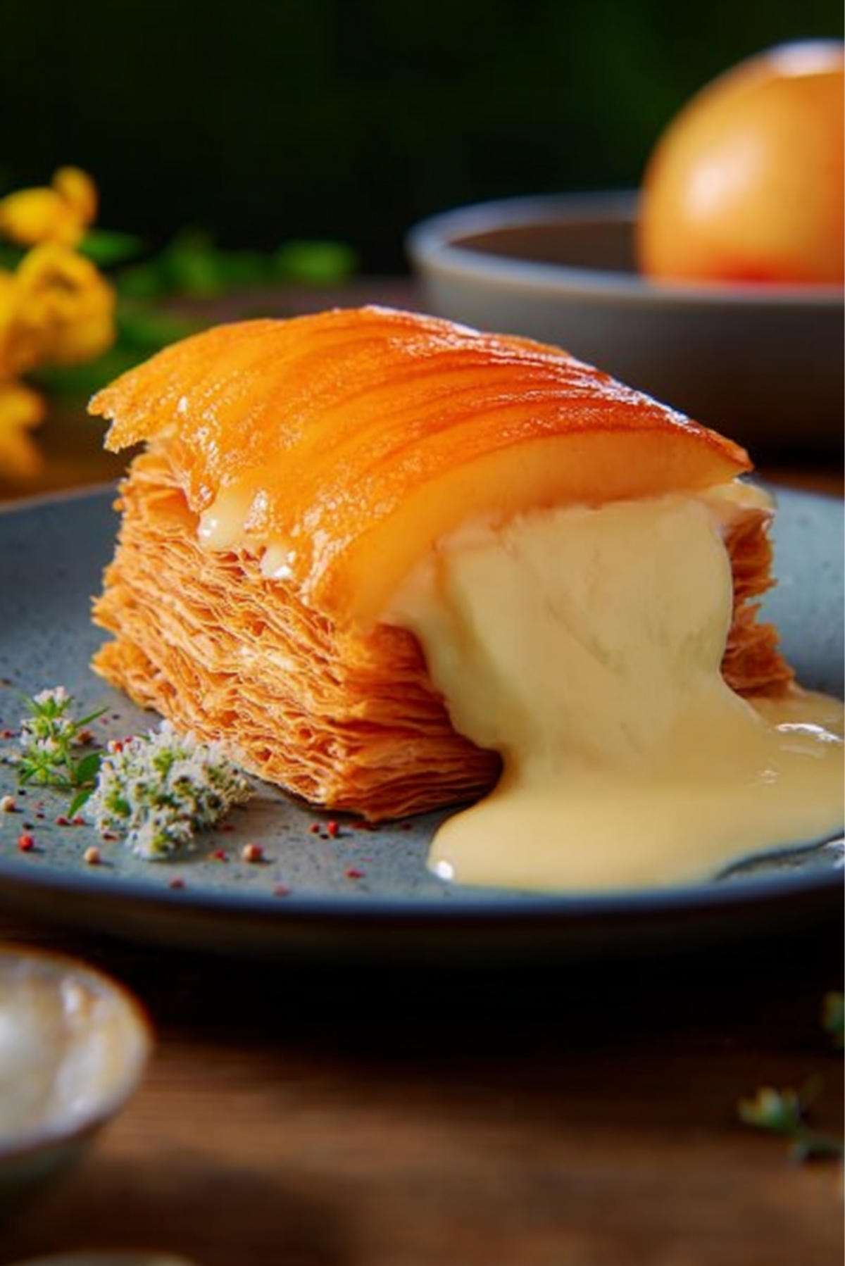- Once cooled, layer pastry, custard, and apples alternately to create the Mille-Feuille.