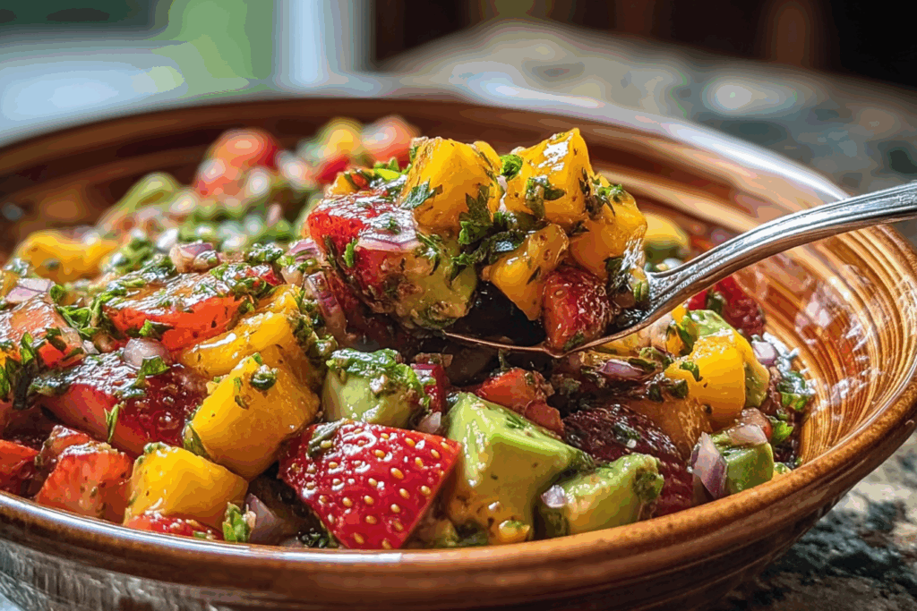 This salsa was inspired by those lazy summer afternoons when the air smells like cut grass and ripe fruit fills every market stand. It’s the kind of dish you make when you want something easy but impressive, a quick mix that feels like a tropical getaway in a bowl. I first made this after a weekend trip to the farmers’ market, where I couldn’t resist the piles of ruby-red strawberries and golden mangoes — and trust me, it’s been a warm-weather favorite ever since.