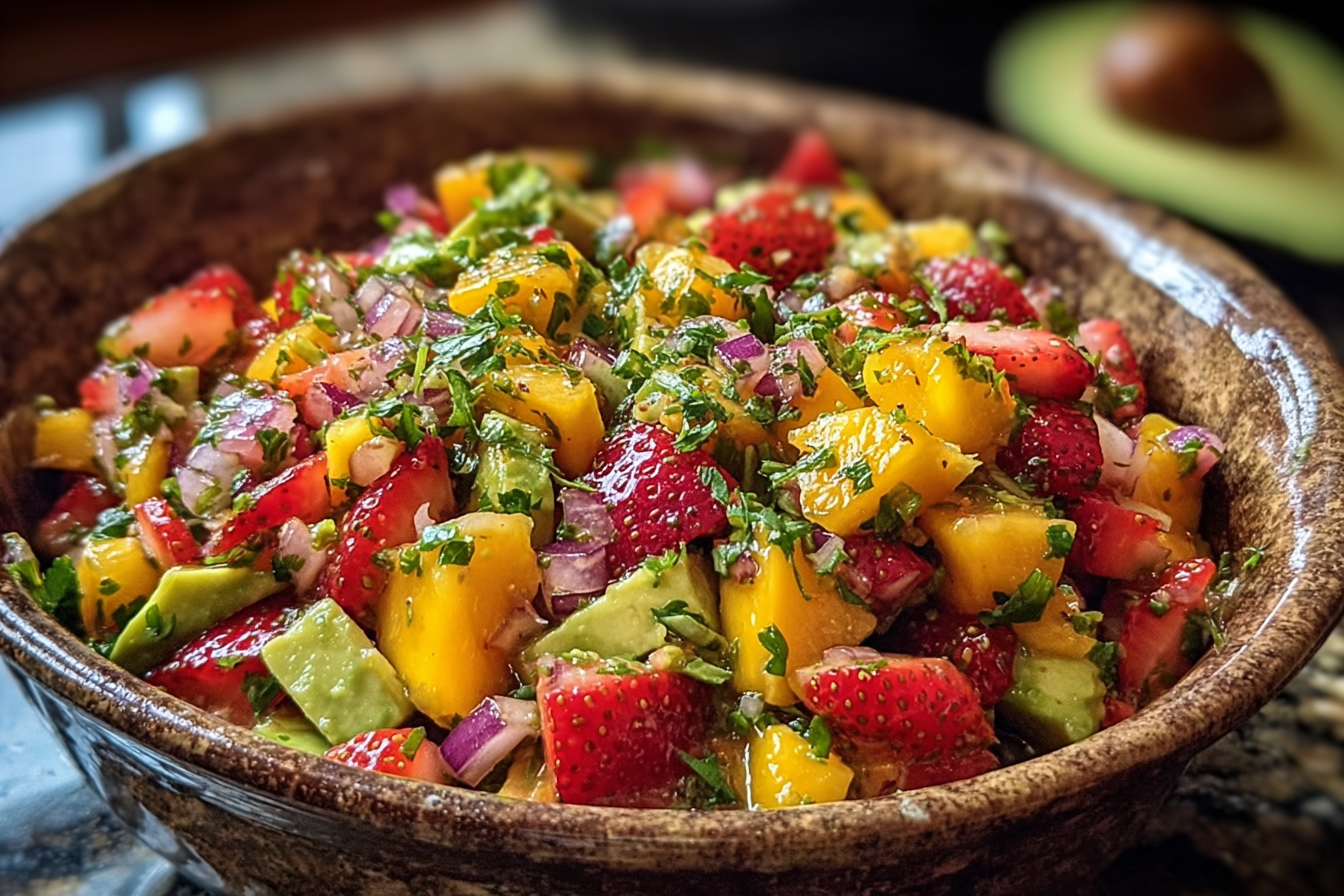 A vibrant and refreshing mix of creamy avocado, juicy strawberries, and tropical mango tossed with zesty lime, jalapeño, and cilantro. This no-cook salsa is perfect for summer gatherings, taco nights, or as a colorful topping for grilled dishes.