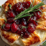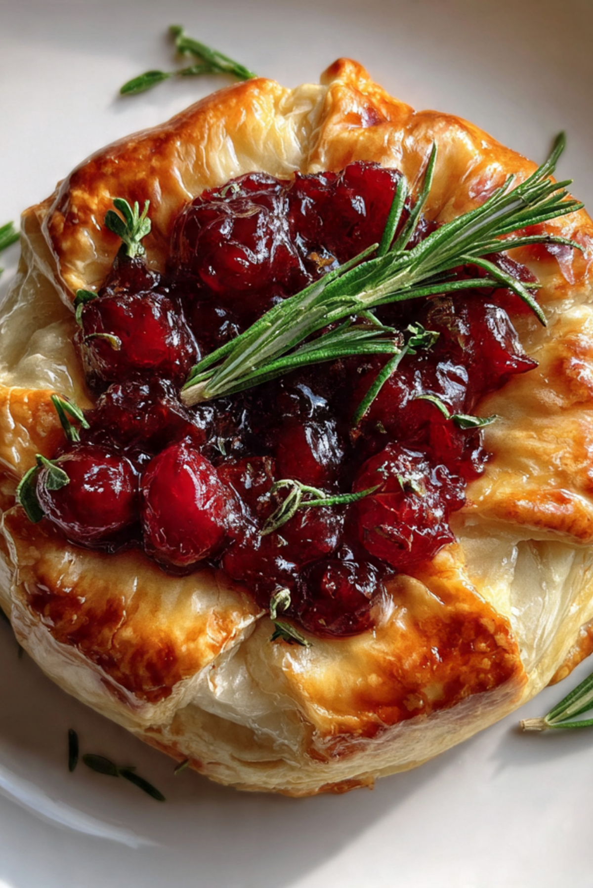 Golden, flaky baked brie topped with tart cranberry sauce and aromatic rosemary — the perfect elegant appetizer for any occasion.