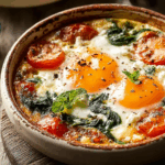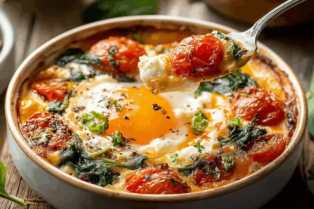 A Mediterranean-inspired baked breakfast featuring creamy feta, juicy cherry tomatoes, and tender spinach, all topped with perfectly baked eggs. This dish is comforting, wholesome, and ready in just 30 minutes.