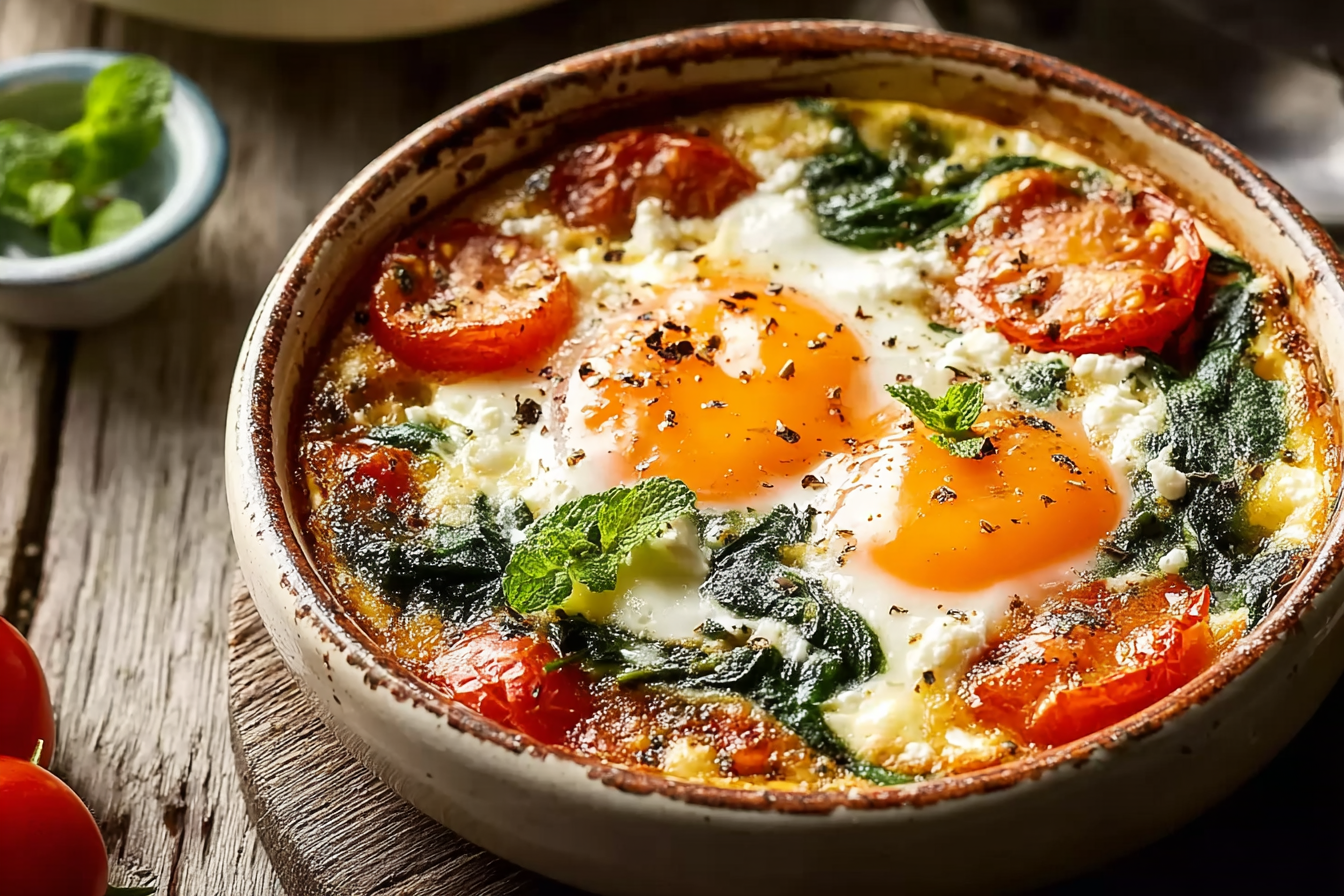 A Mediterranean-inspired baked breakfast featuring creamy feta, juicy cherry tomatoes, and tender spinach, all topped with perfectly baked eggs. This dish is comforting, wholesome, and ready in just 30 minutes.