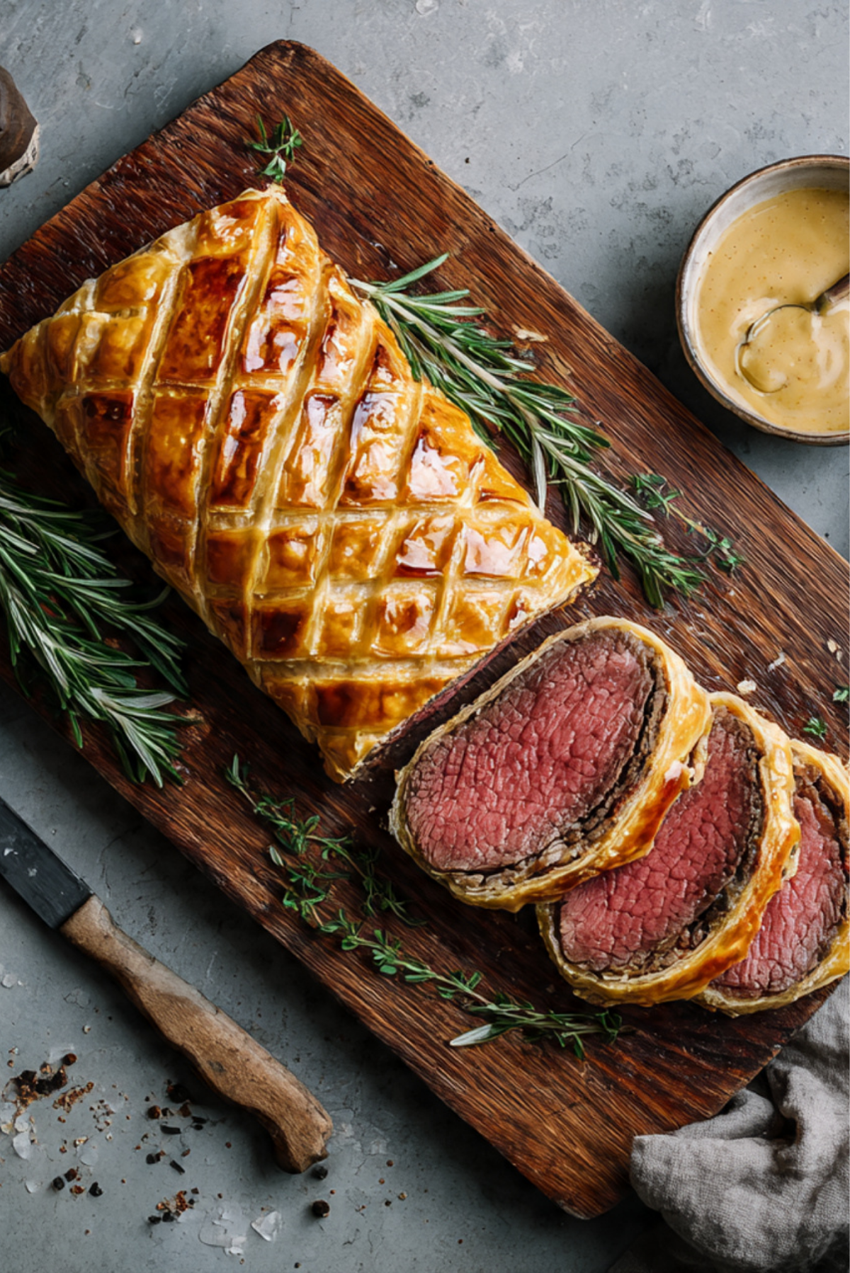 Let the Wellington rest for 10–15 minutes before slicing. Garnish with rosemary or flaky sea salt if desired. -