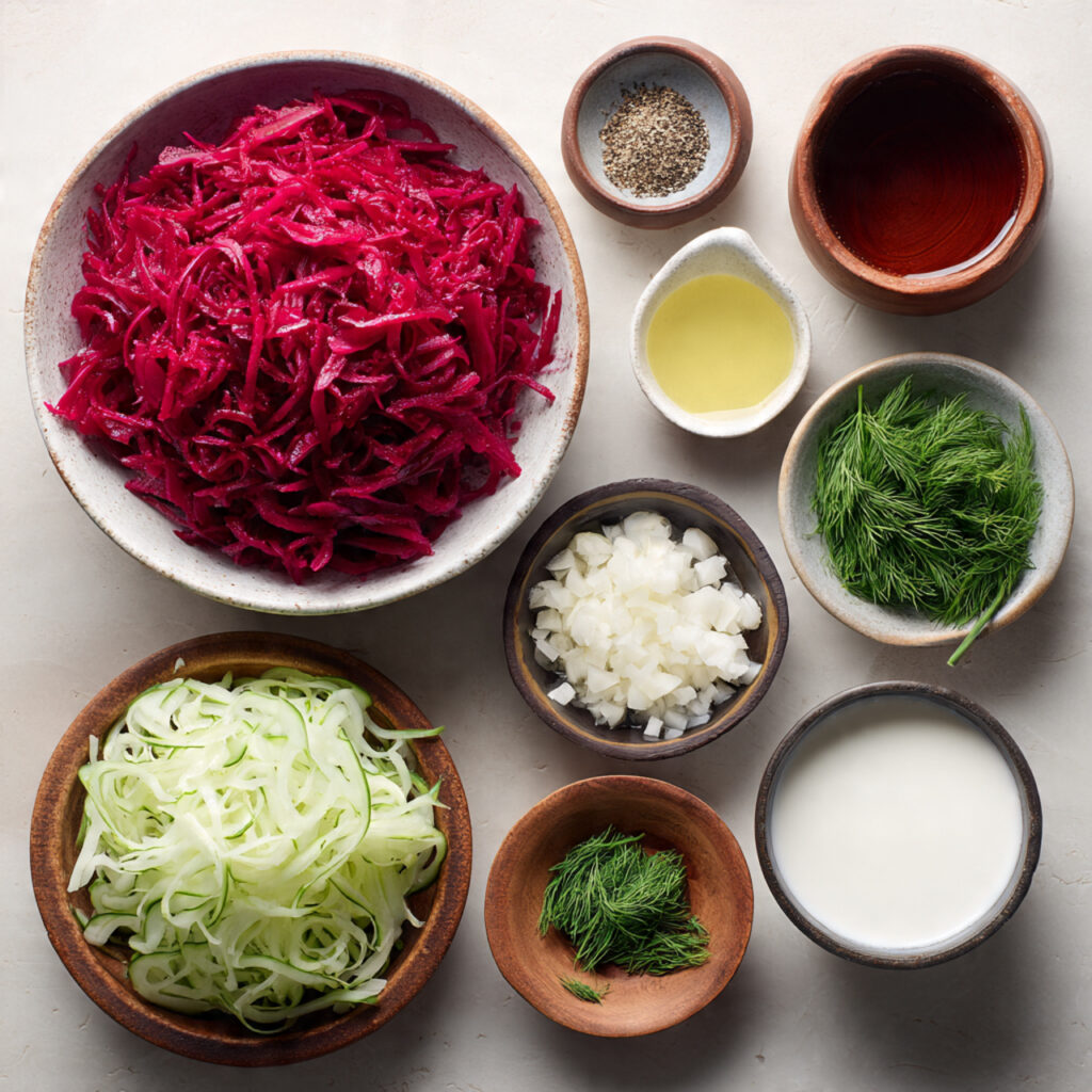 Ingredients in Borscht with Buttermilk and Grated Cucumber