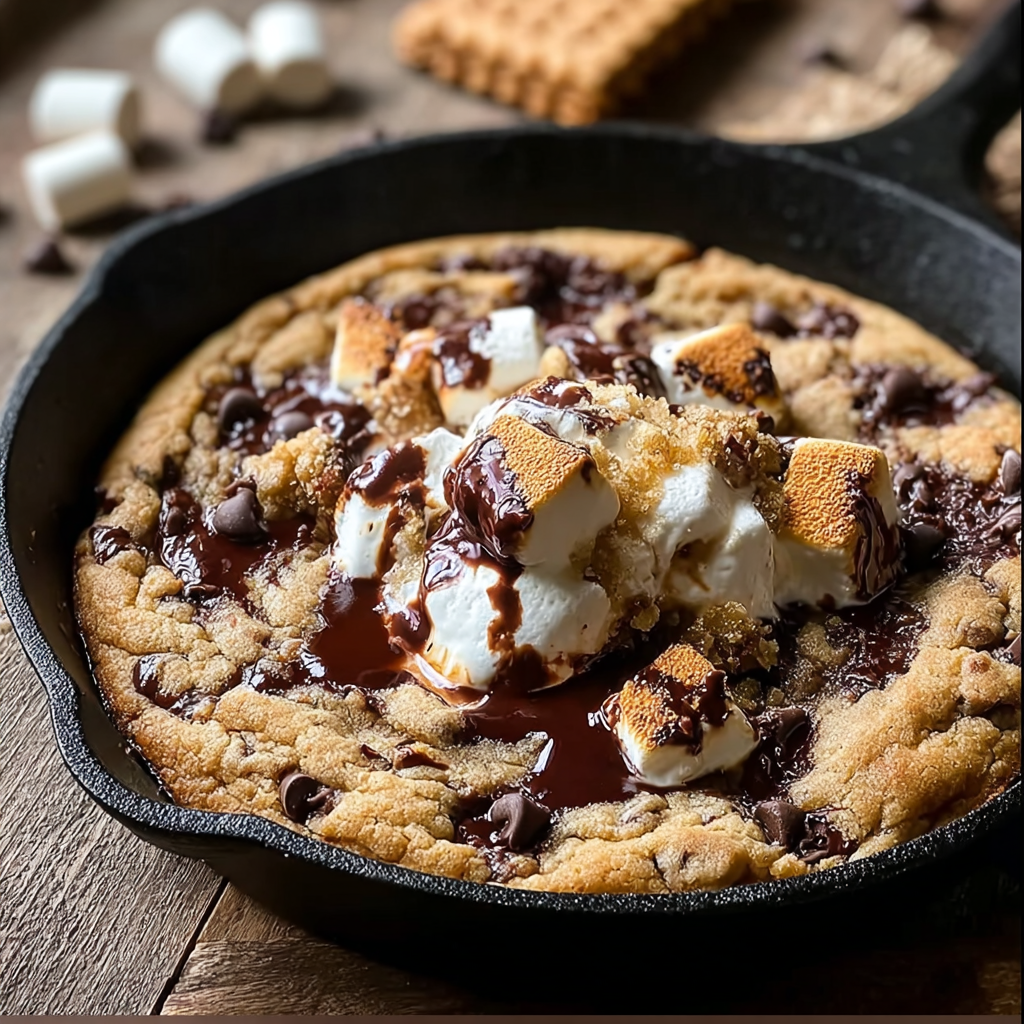 A gooey, golden skillet cookie packed with brown butter richness, melty chocolate chips, graham cracker crunch, and toasted marshmallows for the ultimate campfire-inspired dessert.