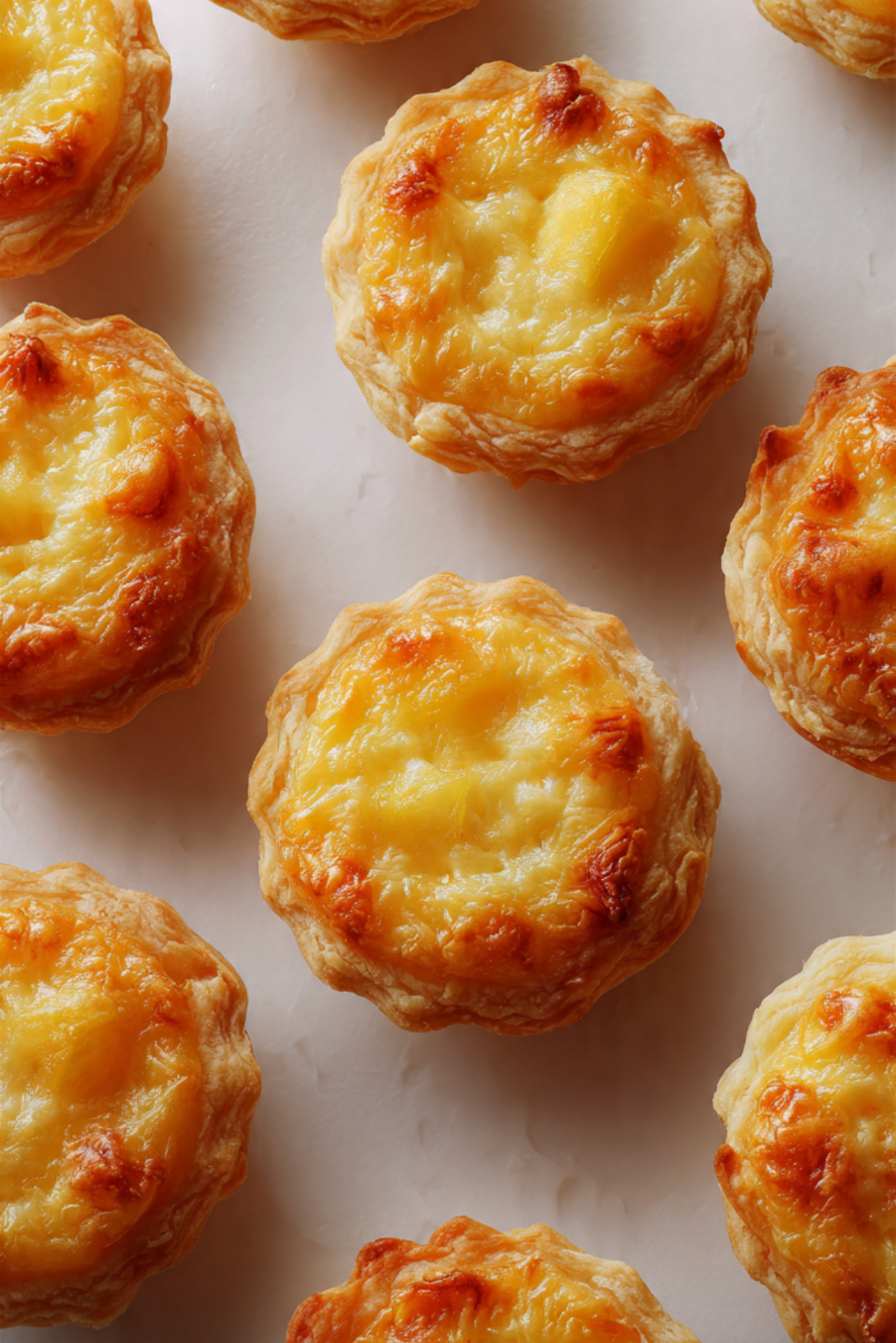 Buttery mini tarts filled with sweet pineapple jam and topped with savory melted cheddar cheese, creating a perfect balance of flavors in every bite.