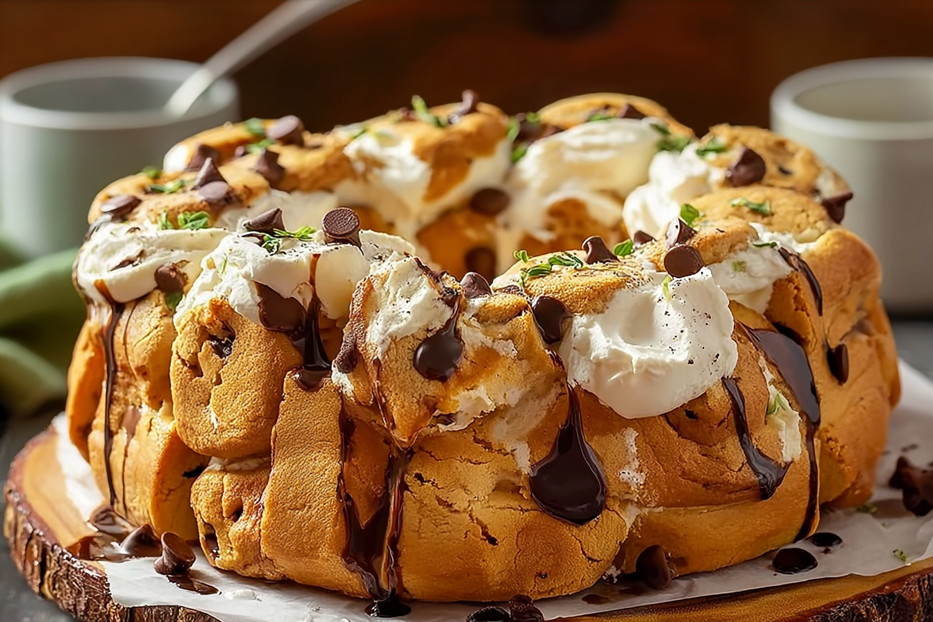 A gooey, indulgent dessert that combines cheesecake filling, cookie dough bites, and soft pull-apart bread into one irresistible cake.