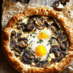 A savory Cheesy Mushroom Tart with Eggs featuring a flaky pastry, sautéed mushrooms, and perfectly set eggs, ideal for brunch or a light meal