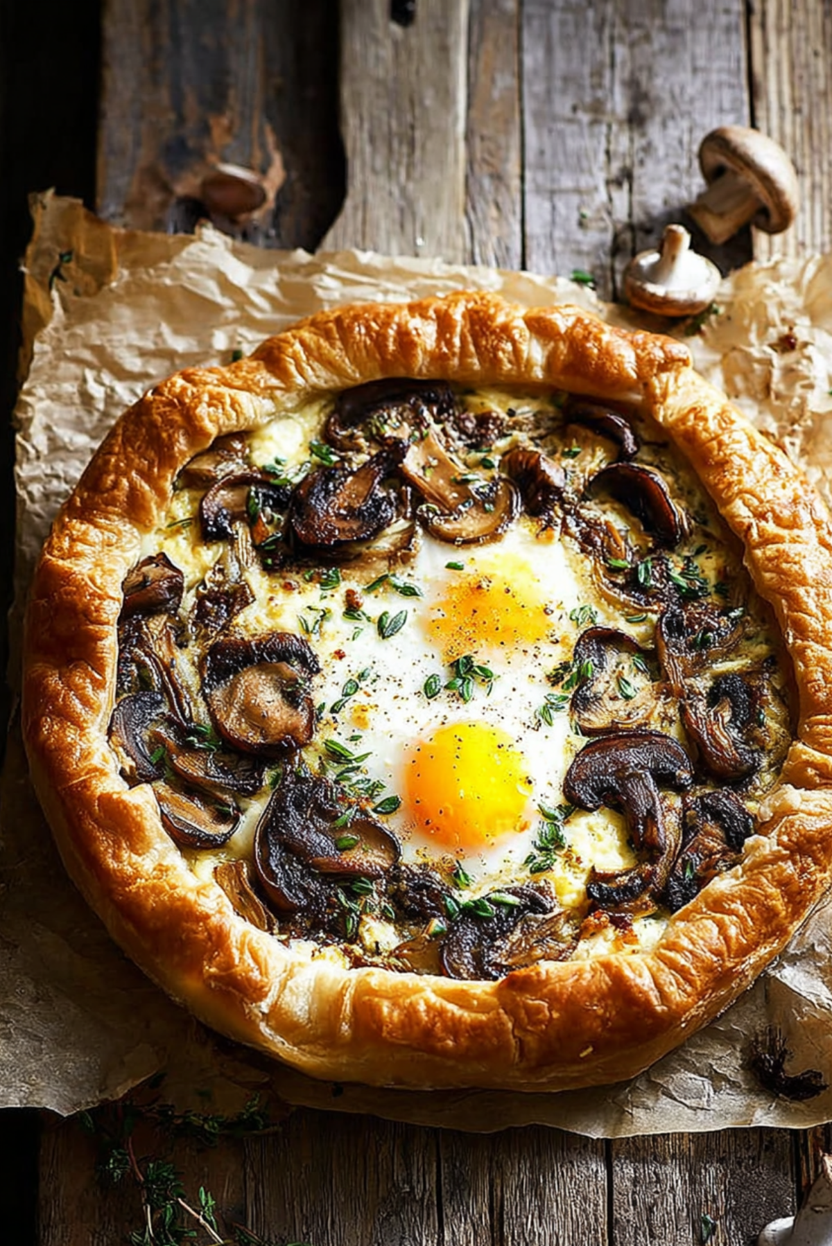- Assemble the Dish: Sauté mushrooms, spread cheese mixture over pastry, top with mushrooms, create wells and crack eggs, season with black pepper, fold edges slightly