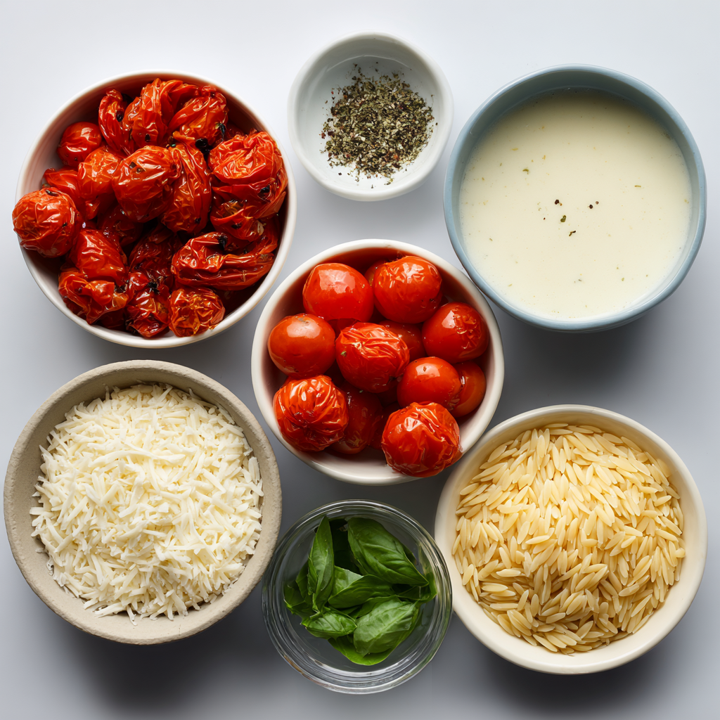 Ingredients in Cheesy Orzo with Roasted Cherry Tomatoes