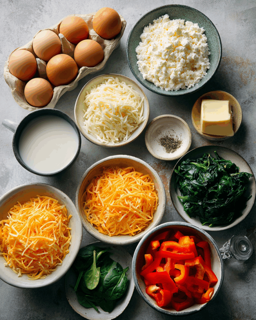 - Combine Ingredients: In a large bowl, whisk the eggs until smooth. Add milk, cottage cheese, salt, and pepper, then fold in the veggies and shredded cheese.
