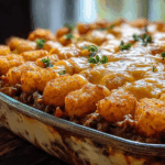 A hearty comfort food classic that layers juicy meatloaf, crispy golden tater tots, and gooey melted cheese into one irresistible casserole.