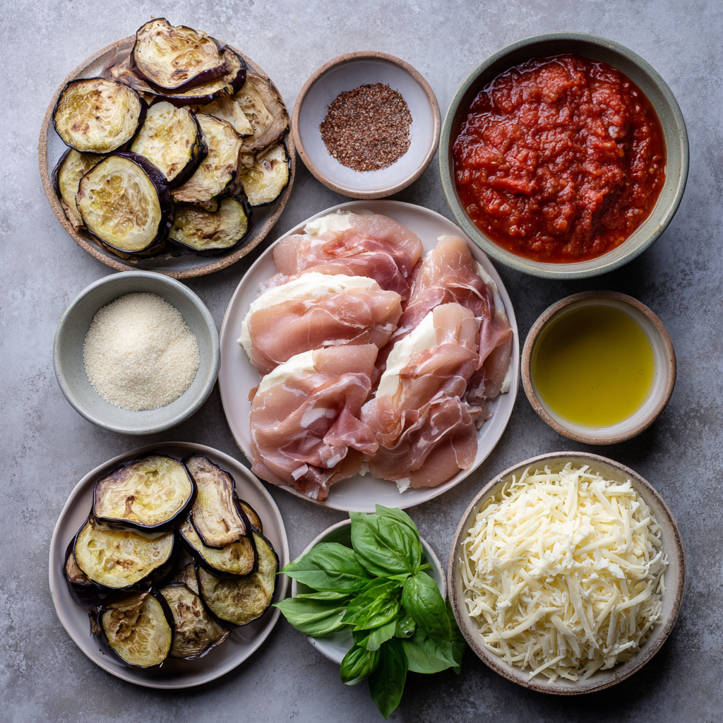 - Spread a thin layer of tomato sauce in the baking dish. Layer chicken, prosciutto, eggplant, sauce, and mozzarella. Repeat layers until ingredients are used.