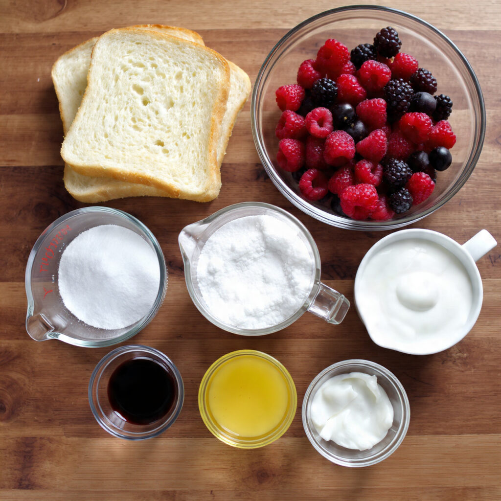 - White Bread: 10–12 slices, crusts removed. Forms the structure and soaks up berry juices.