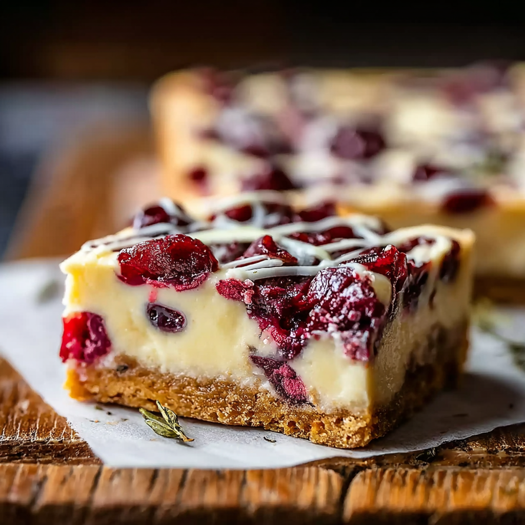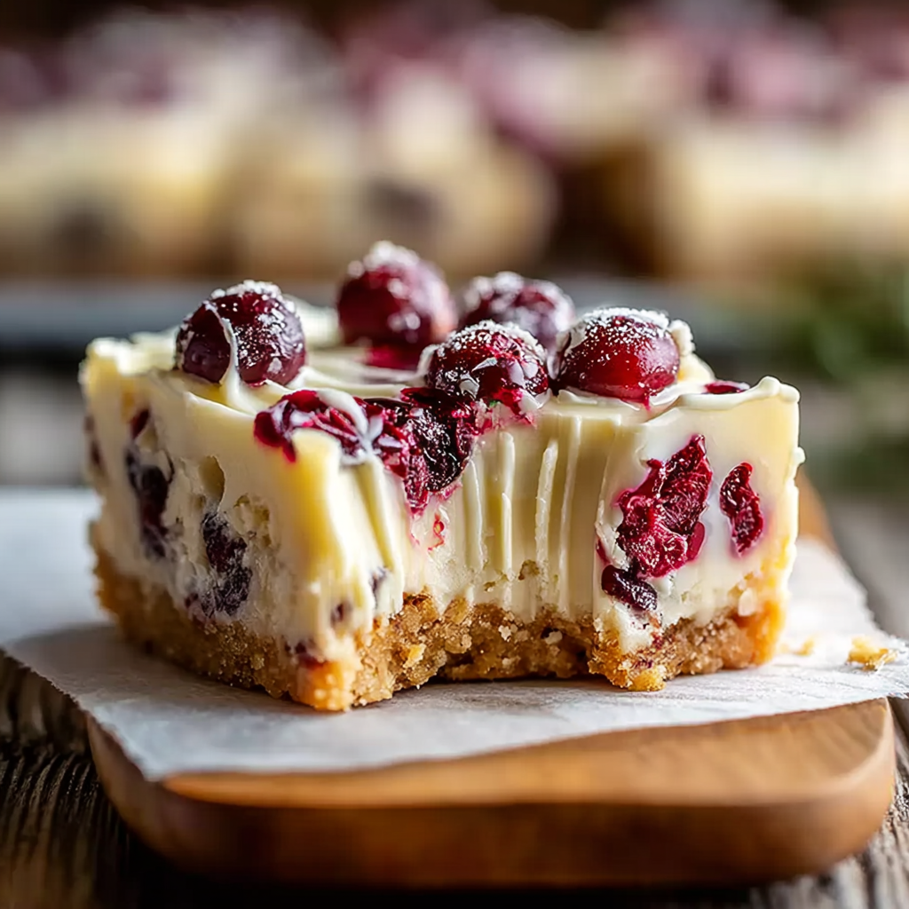 - Finishing Touches: Beat cream cheese, powdered sugar, and vanilla until smooth. Spread frosting over cooled bars. Sprinkle chopped cranberries on top and drizzle with melted white chocolate.
