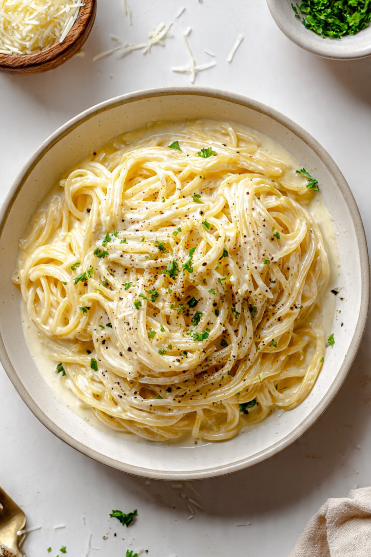 Twirl the pasta into neat nests using tongs before plating. Finish with a light sprinkle of parsley and a touch of freshly cracked pepper. Serve in wide white bowls to highlight the creamy texture.