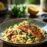 Creamy Lemon Garlic Orzo with Salmon is a comforting yet refreshing pasta dish made with tender salmon, silky orzo, and a luscious lemon-garlic cream sauce. It’s quick to prepare, rich in flavor, and perfect for weeknight dinners or elegant gatherings.
