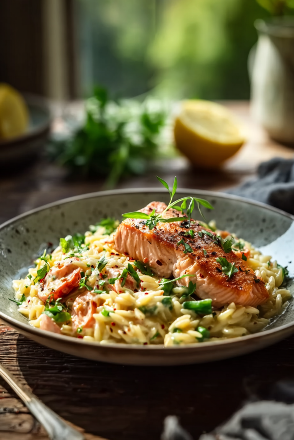 For presentation, flake the salmon slightly before serving so the pink contrasts against the creamy orzo. Add a lemon slice on top and sprinkle microgreens or parsley for that restaurant-style touch.
