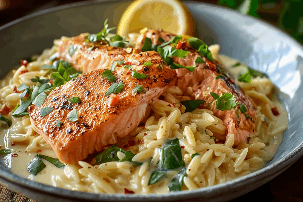 This recipe came to life on a cozy Sunday evening when I wanted something hearty but fresh. Orzo has always been my go-to pasta when I’m craving something creamy without the heaviness of traditional dishes. Pairing it with pan-seared salmon and a zesty lemon-garlic cream was a happy experiment that turned into a weeknight favorite. It’s comforting yet sophisticated, a perfect mix of indulgence and simplicity.