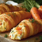 Crescent rolls, beloved for their flaky, buttery layers, originated from the French croissant tradition but gained their modern convenience through American innovation. Pairing them with classic egg salad is a playful nod to American picnic culture — comforting, familiar, yet creative enough to feel fresh. These “carrots” are a fun take on themed finger foods that became popular at spring parties and Easter gatherings.