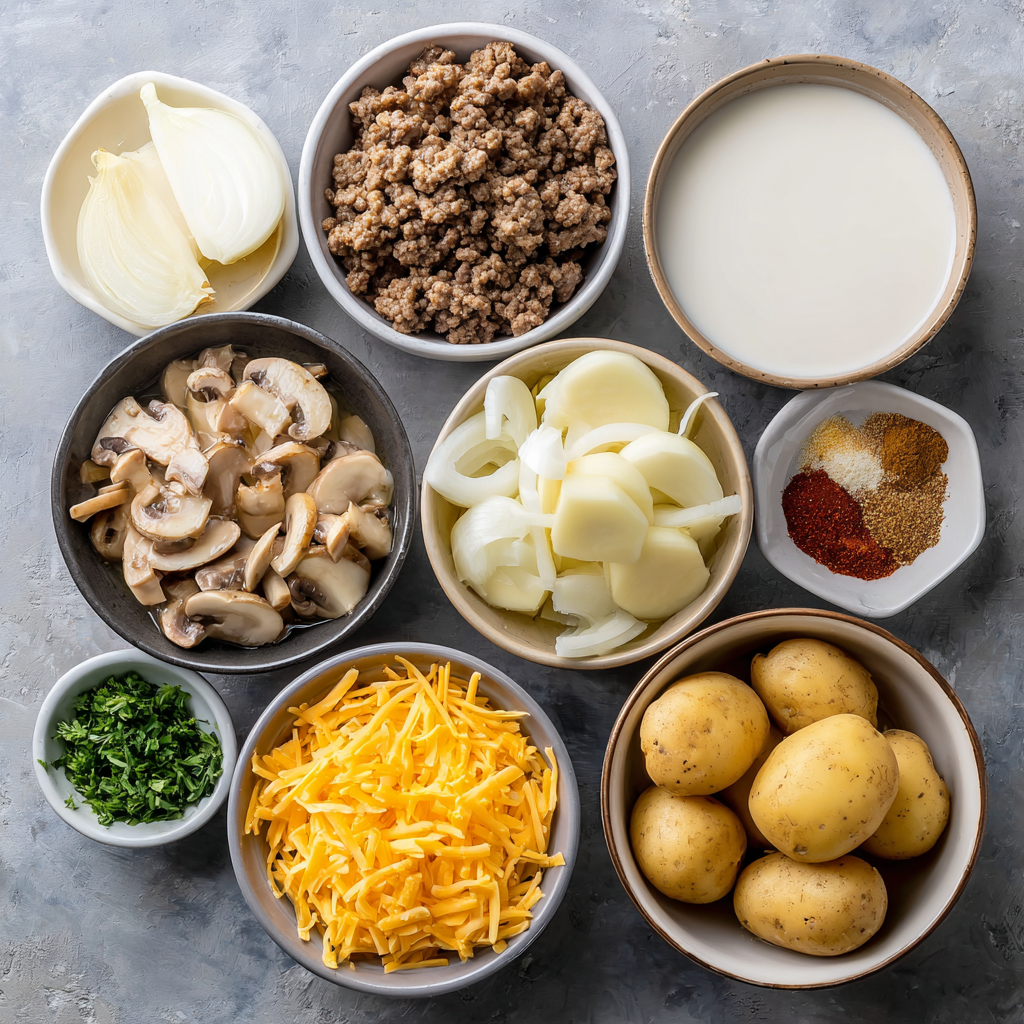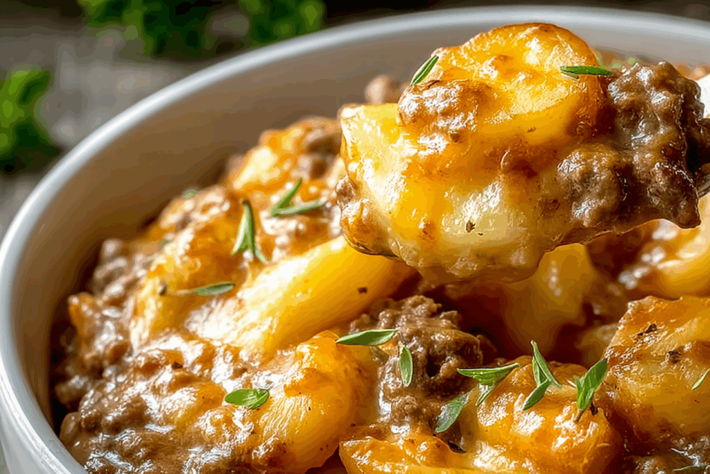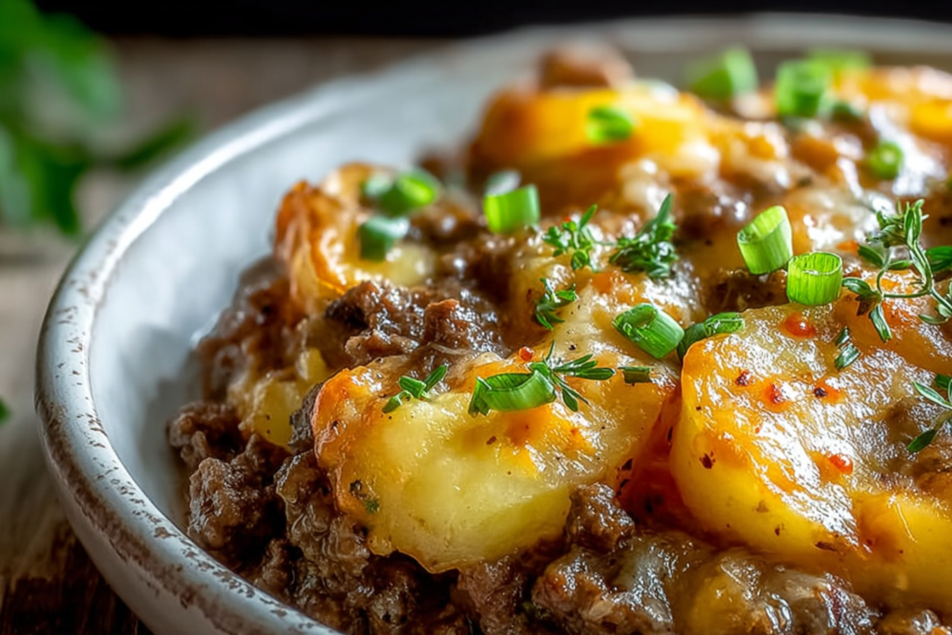 A creamy, cheesy slow-cooked casserole layered with seasoned ground beef, thinly sliced potatoes, and melted cheddar, perfect for easy weeknight comfort or make-ahead family dinners.