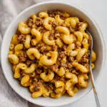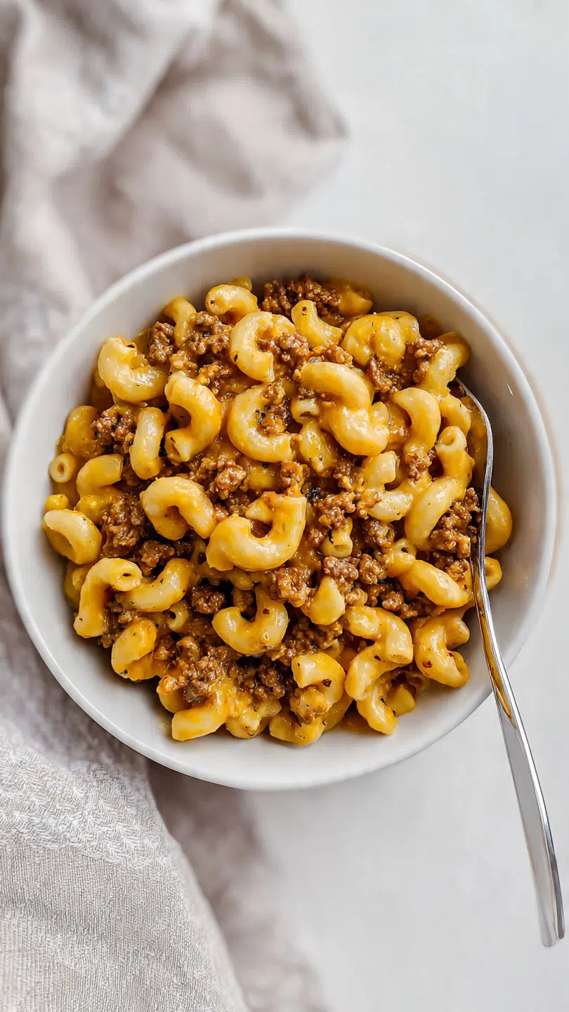 A creamy and comforting dairy free cheeseburger macaroni made with seasoned ground beef, tender pasta, and a smooth plant based cheddar style sauce.