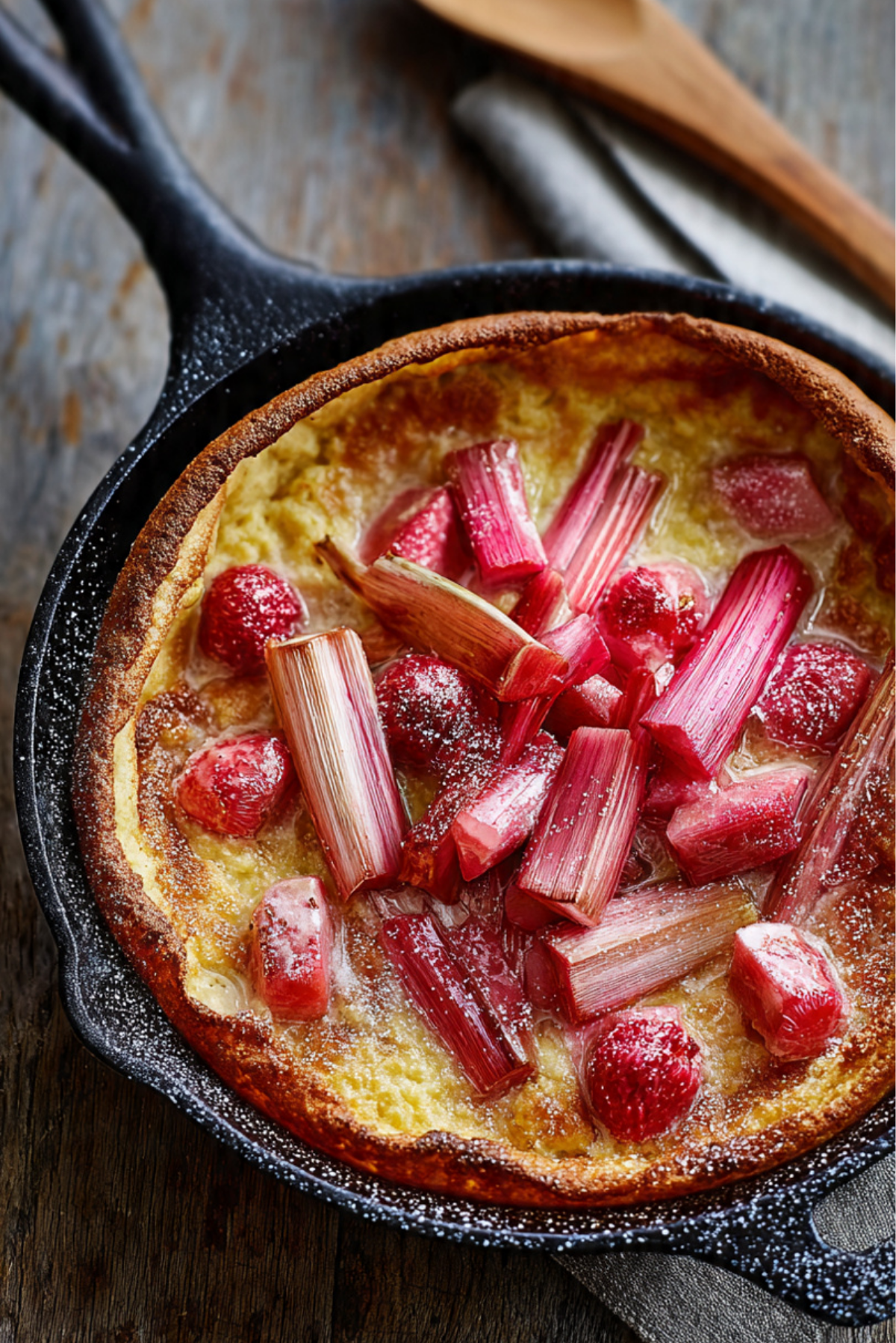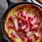 Imagine a pancake that’s part soufflé, part crepe, and all magic—fluffy, golden, and curled dramatically at the edges. Now top that with sweet-tart roasted rhubarb and a drizzle of maple syrup, and you’ve got a dish that feels like a cozy weekend morning tucked into a cast iron skillet.