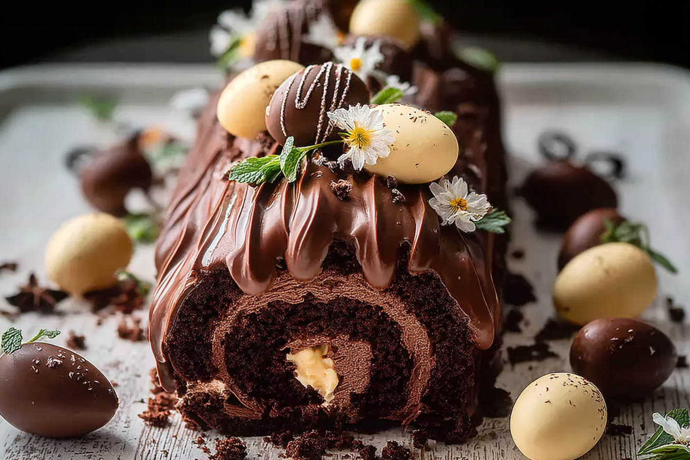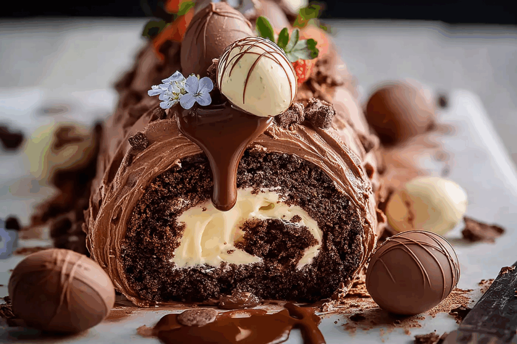 A luscious Easter Chocolate Log Cake featuring a light cocoa sponge rolled with creamy chocolate filling and topped with glossy ganache — a stunning showstopper for your spring celebrations.