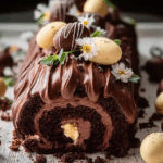 A luscious Easter Chocolate Log Cake featuring a light cocoa sponge rolled with creamy chocolate filling and topped with glossy ganache — a stunning showstopper for your spring celebrations.