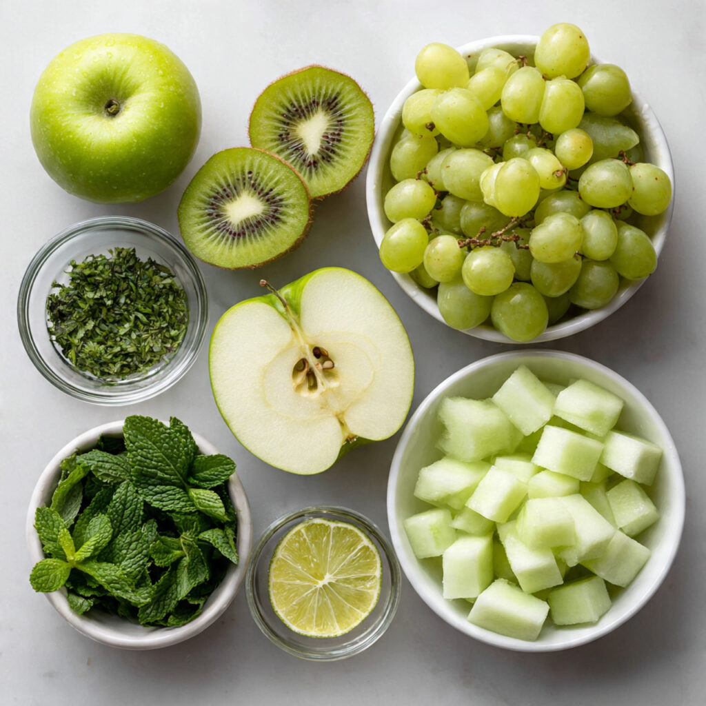 A vibrant, refreshing green fruit salad featuring crisp apples, juicy grapes, sweet kiwi, and honeydew, tossed with fresh mint and a splash of lime. It’s quick, beautiful, and perfect for any occasion.