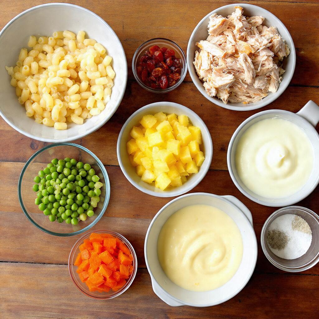 - In a large bowl, combine cooked macaroni, shredded chicken, carrots, peas, pineapple, raisins, and pickle relish.