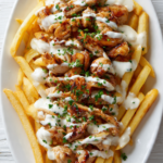 You know those meals that instantly make everyone gather around the table? This is one of them. The crispy fries soak up the savory juices from the chicken, while the creamy sauce ties everything together in the most delicious way. Each bite gives you crunch, tenderness, and bold flavor all at once. It feels like street food meets comfort food, and honestly, that is always a winning combination.