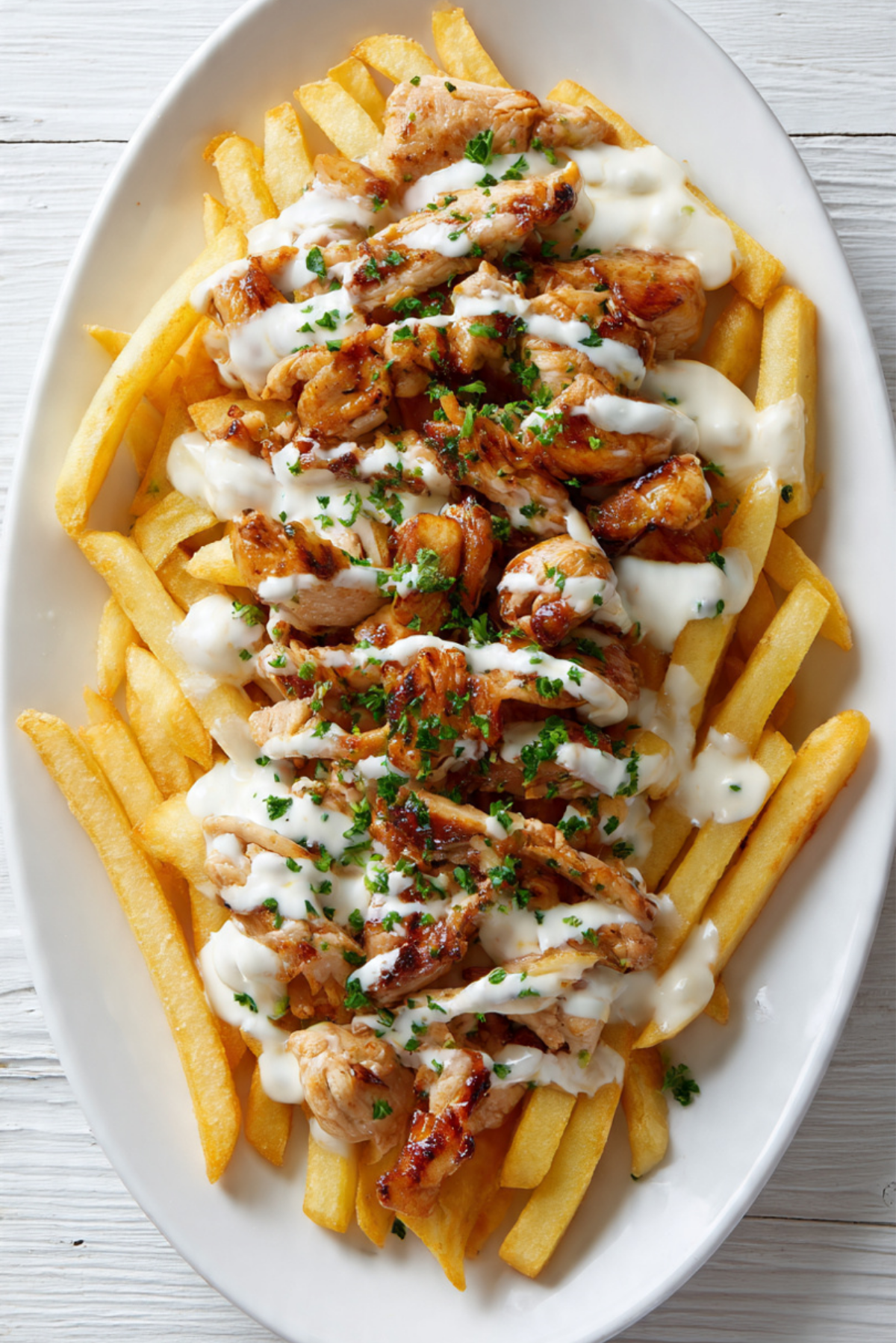 - Layer fries on a serving platter, top with cooked chicken, drizzle with garlic sauce, and sprinkle chopped parsley.
