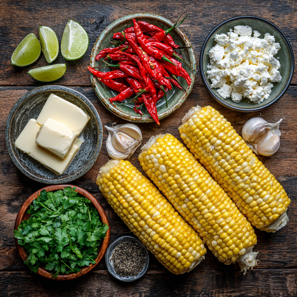 Ingredients in Garlic Butter Roasted Corn with Feta and Chilies