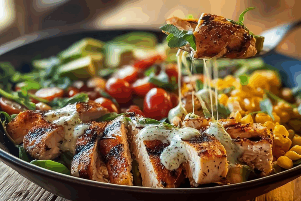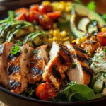 A vibrant and wholesome Grilled Chicken & Avocado Salad Bowl bursting with fresh flavors, juicy grilled chicken, creamy avocado, crisp greens, and a zesty lemon-garlic dressing. Perfect for a quick, nourishing meal any time of the day.