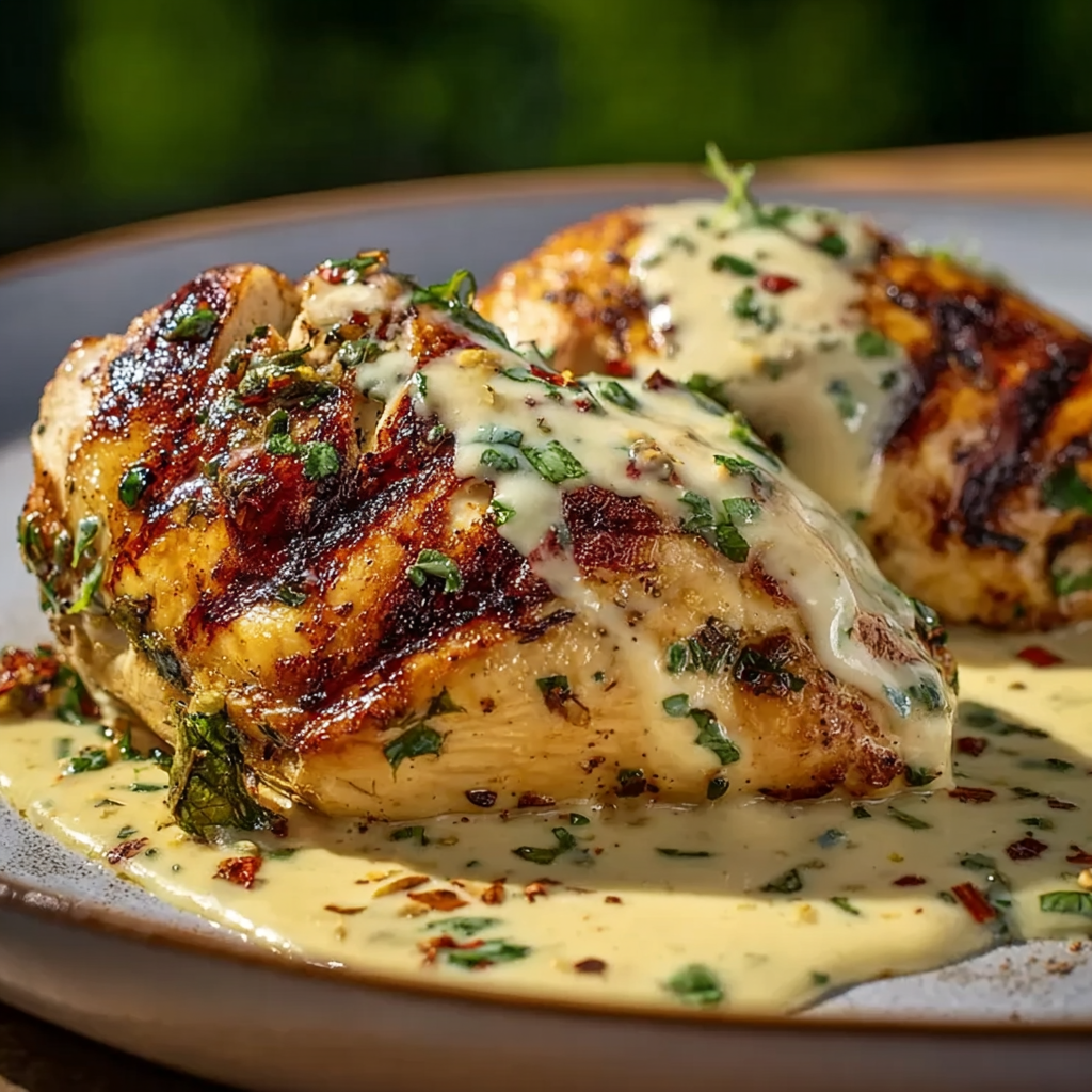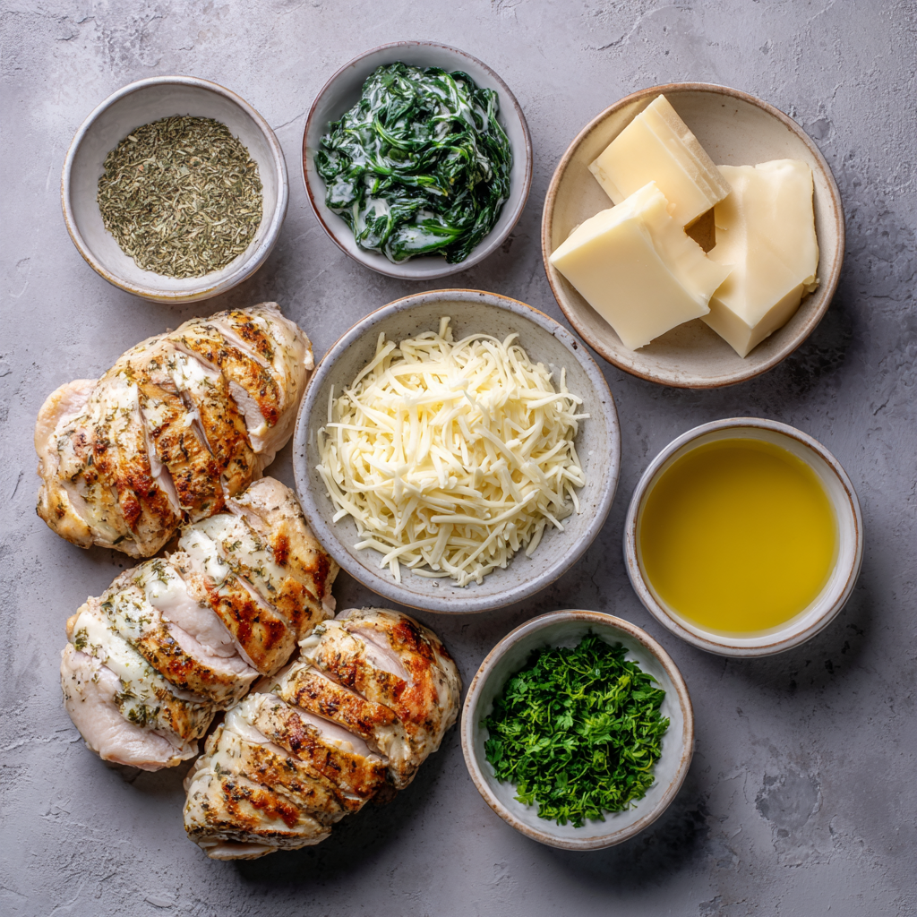 Juicy grilled chicken breasts stuffed with sautéed spinach and melted mozzarella, finished with a silky Parmesan cream sauce. Perfect for a special weeknight or an elegant dinner that comes together quickly.