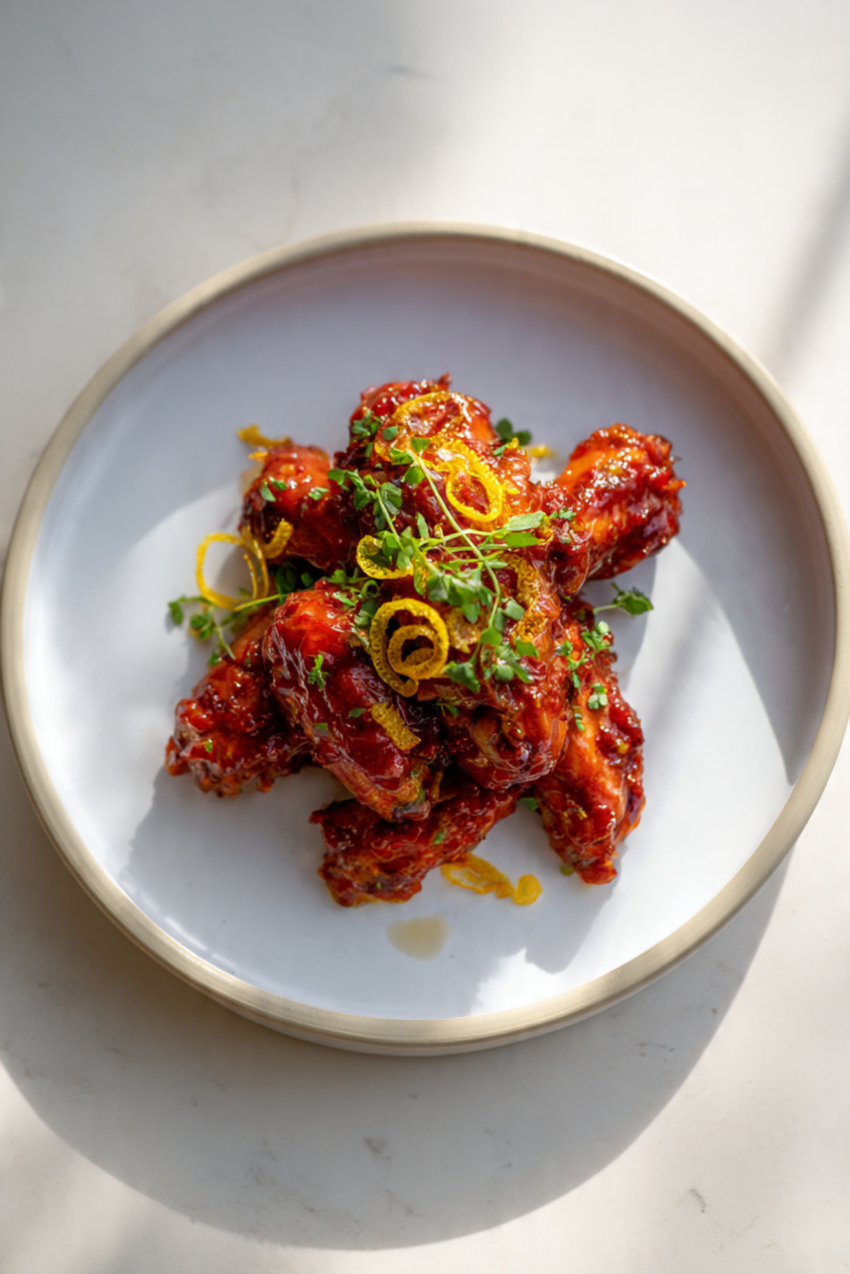 Sticky, smoky harissa chicken wings glazed with preserved lemon marmalade, balancing sweet heat and bright citrus in every juicy bite.