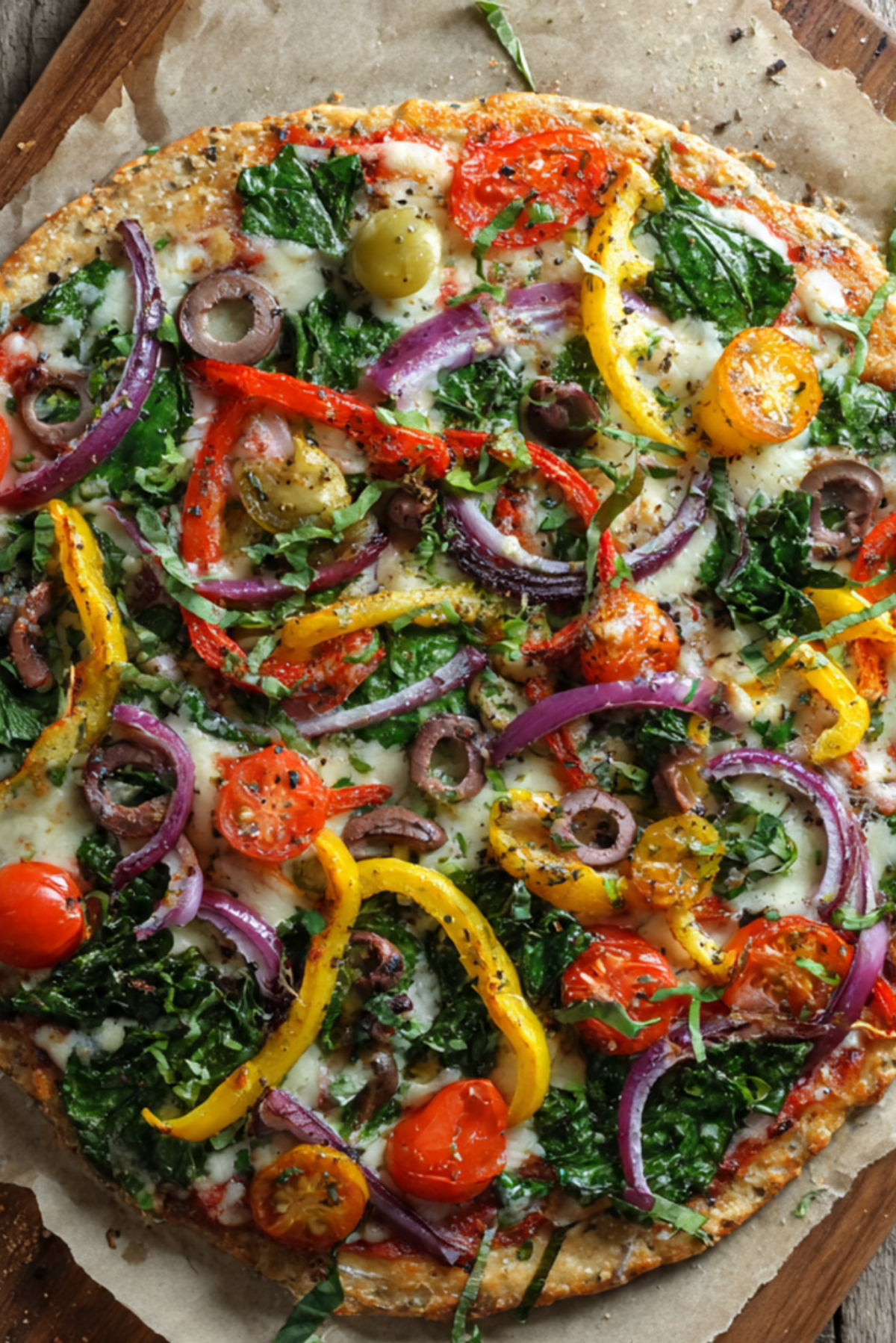 A light, colorful, and veggie-packed healthy pizza with a crispy whole wheat crust and gooey cheese. Perfect for guilt-free indulgence any night of the week.