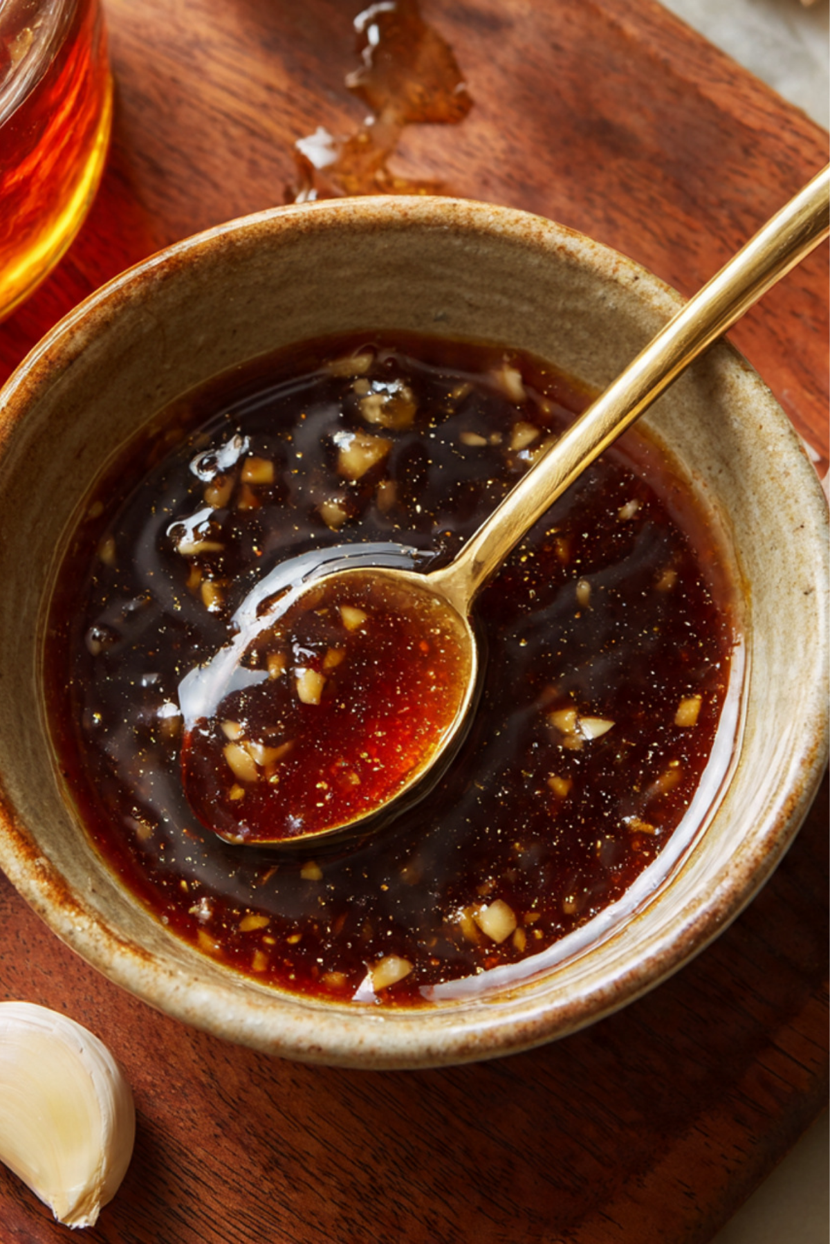 The final sauce should be silky, pourable, and just thick enough to cling to a spoon. You’ll taste deep garlic aroma, sweet caramel notes from the honey, and the savory roundness of soy sauce. A little tang from vinegar (if used) brings it all to life.