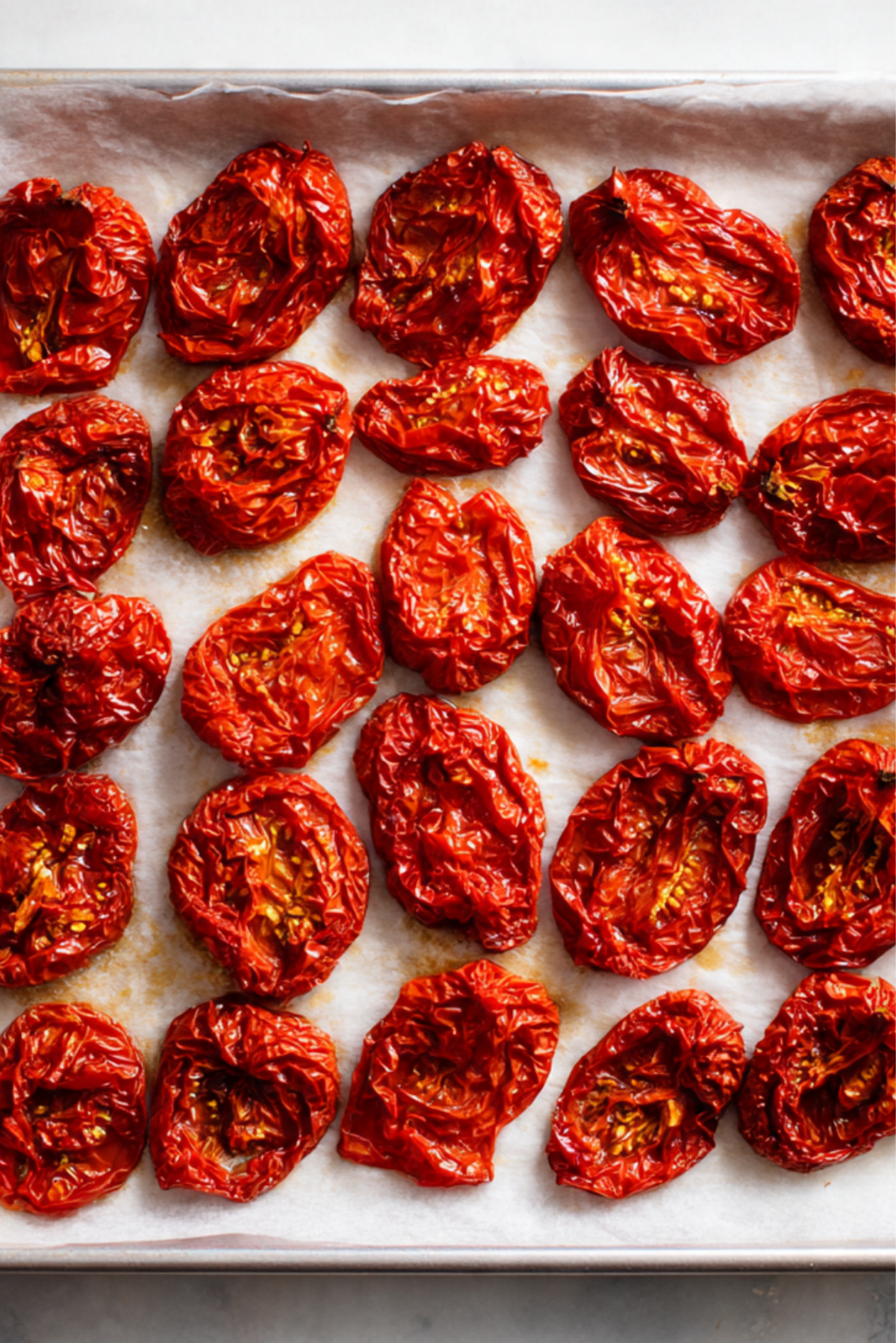 - Line a baking sheet with parchment paper and arrange tomatoes cut-side up in a single layer.