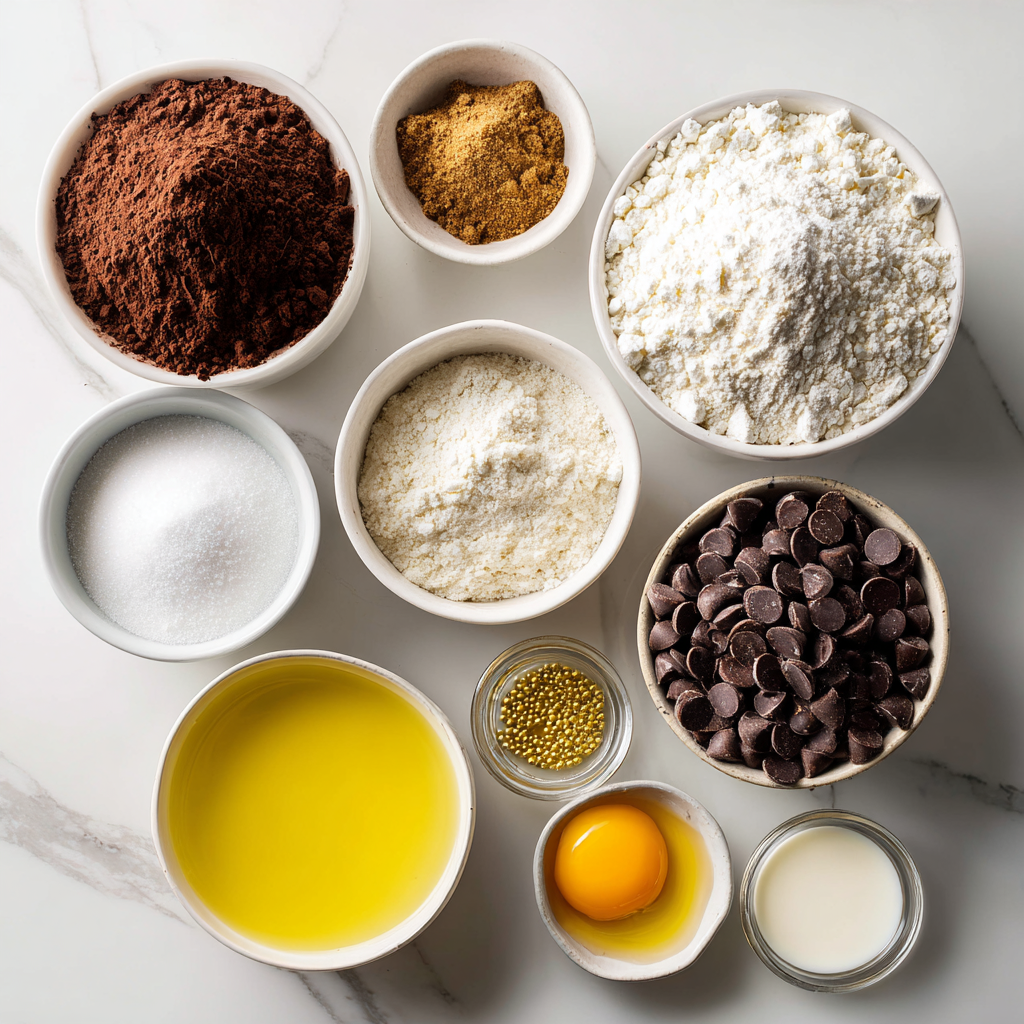 - Combine Ingredients: In one bowl whisk flour, cocoa, baking powder, baking soda, salt, and both sugars. In another bowl whisk eggs, milk, oil, and vanilla.