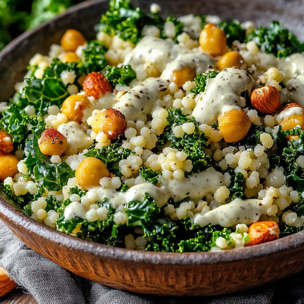 Kale and Couscous Salad is a vibrant, nutritious dish combining tender couscous with fresh kale, crunchy vegetables, and a zesty lemon dressing. Perfect as a light lunch or a healthy side to any meal.