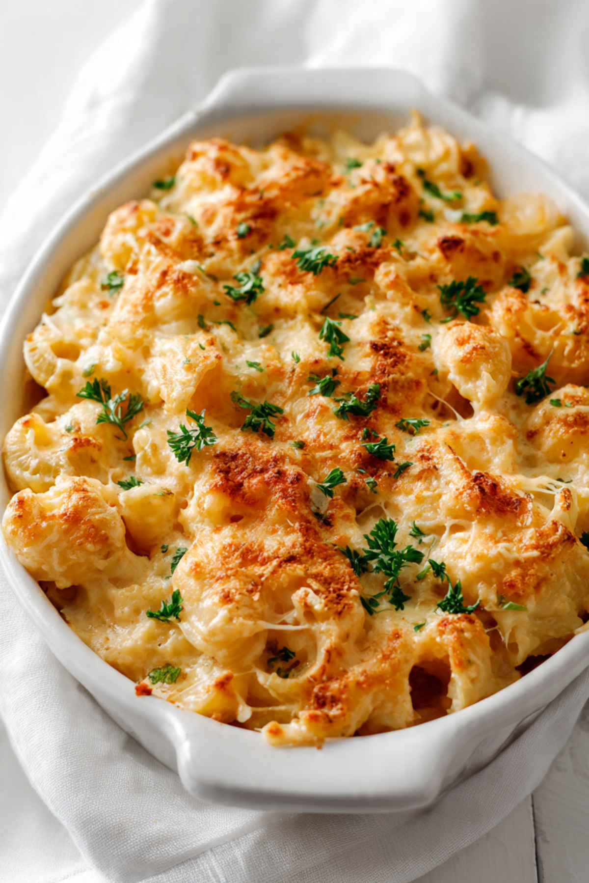 Serve in a white baking dish with a light sprinkle of parsley for contrast. The golden top and creamy interior create a beautiful presentation.