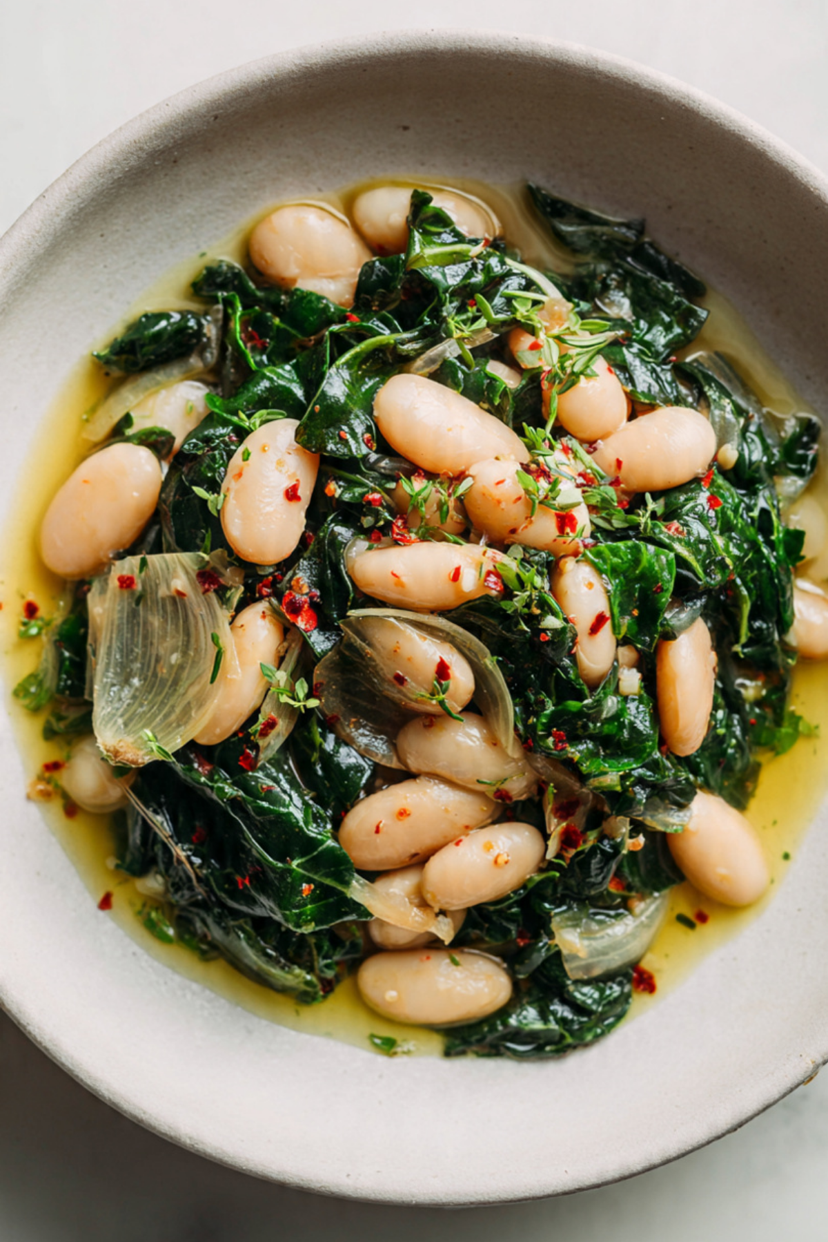 A wholesome Mediterranean-inspired dish of tender white beans and silky greens simmered with garlic, red pepper flakes, and olive oil, perfect for a quick, healthy, plant-based meal.