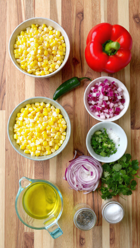 - Combine Ingredients: In a large mixing bowl, add the corn, red bell pepper, red onion, jalapeño, and cilantro.