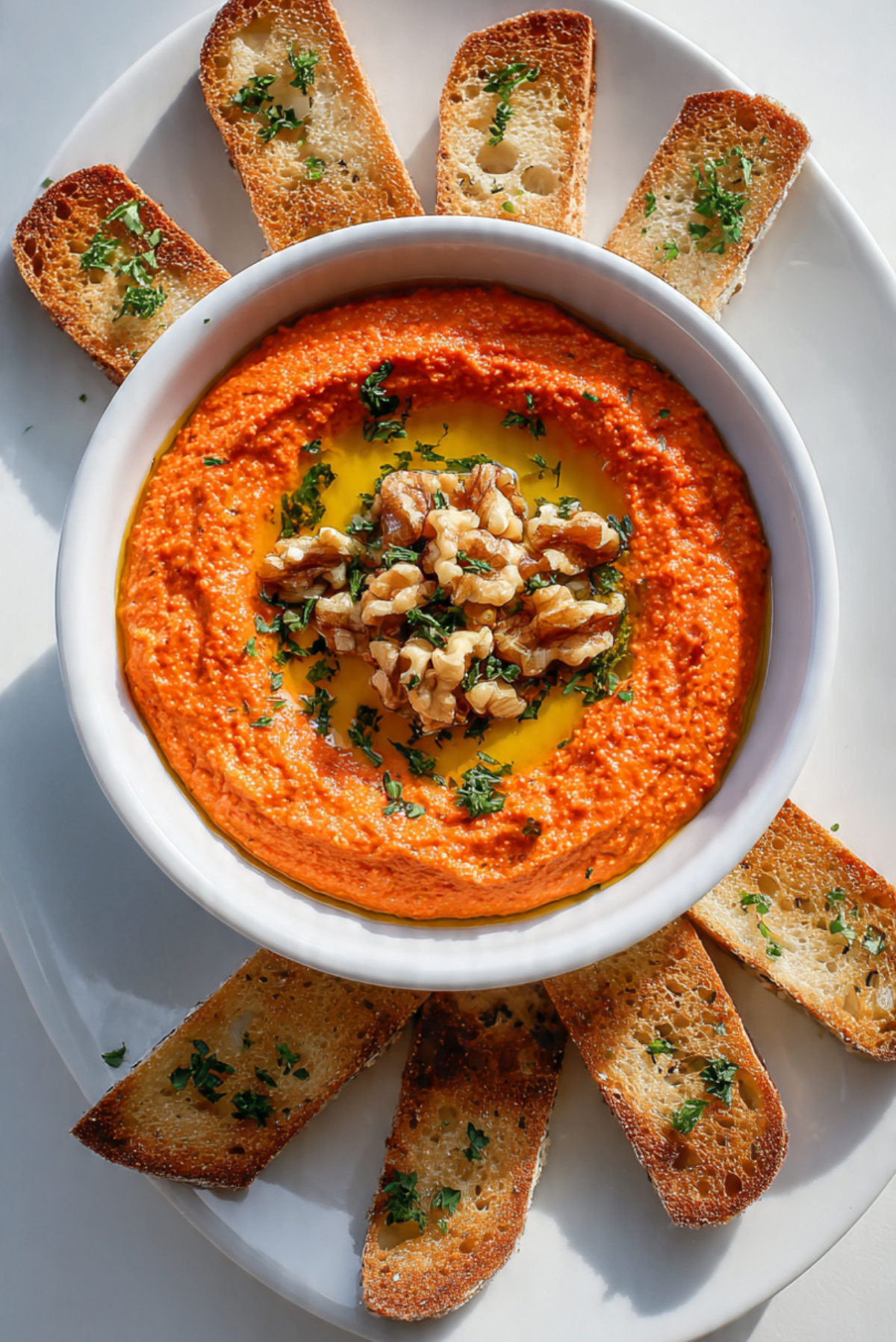 A vibrant roasted red pepper and walnut dip blended with pomegranate molasses and warm spices, served with golden spiced flatbread.