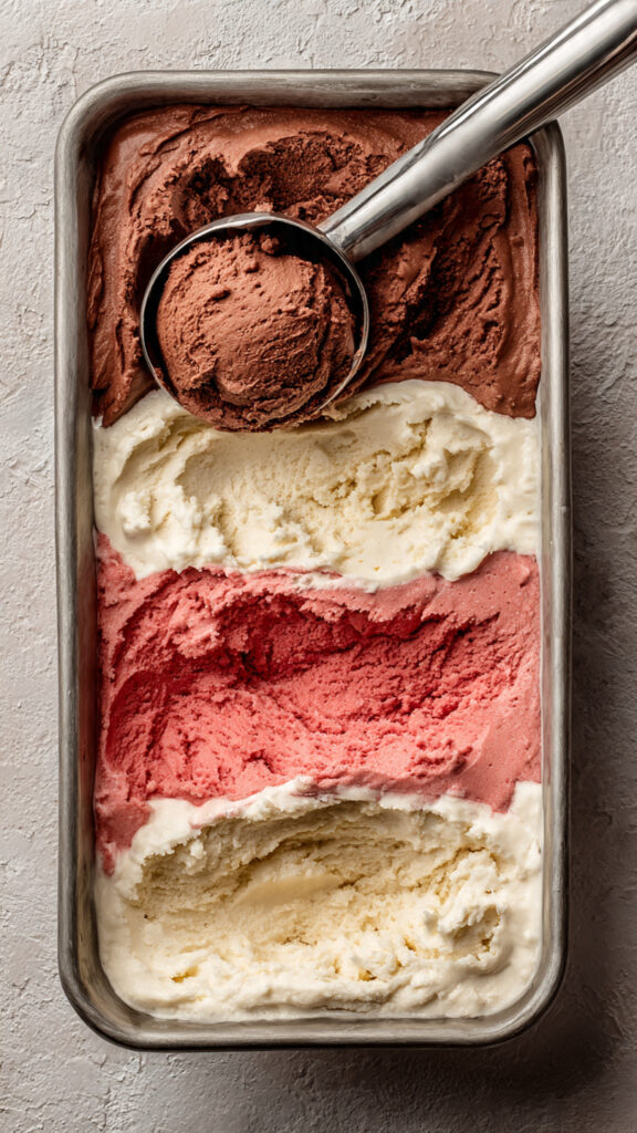 - Assemble the Dish: Spread the chocolate ice cream evenly in the bottom, then add vanilla, then strawberry, smoothing each layer.